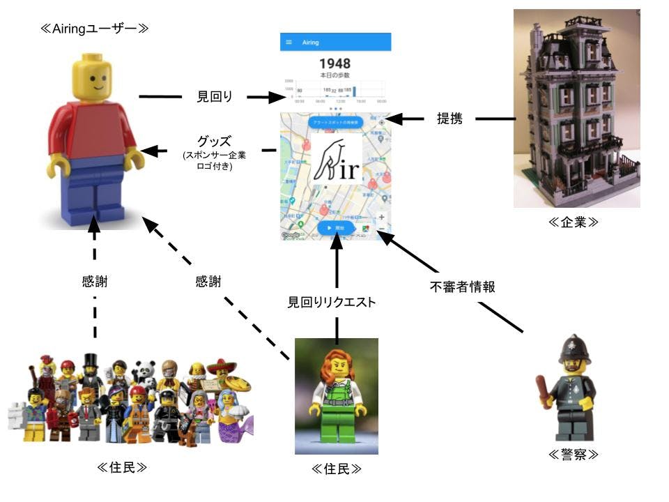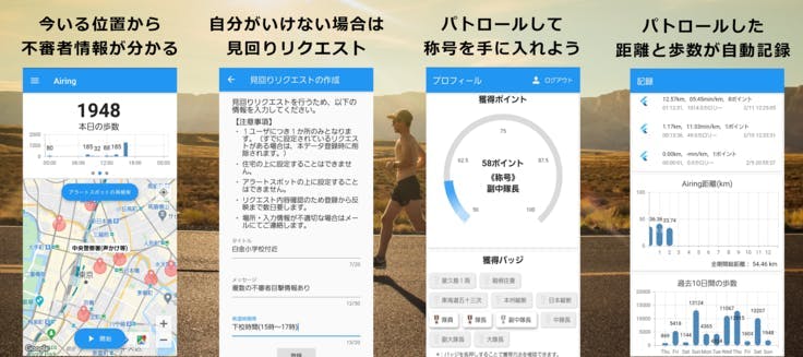 スマホアプリ「Airing(エアリング)」を使用し、ジョギングやウォーキング愛好者による見回りを促し、安全な街の実現を図ります。