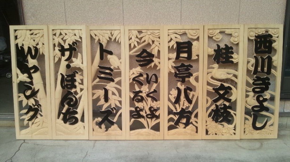 今回は井尻彫刻所で細々と受注をしていた、表札や小物をリターンとしてご用意しました。表札を作り始めたきっかけは、吉本興業さん100周年記念で「なんばグランド花月」の芸人看板を彫ったことからでした。その看板を見た方から「私の表札を作れませんか?」と言われ作ったのが始まりです。