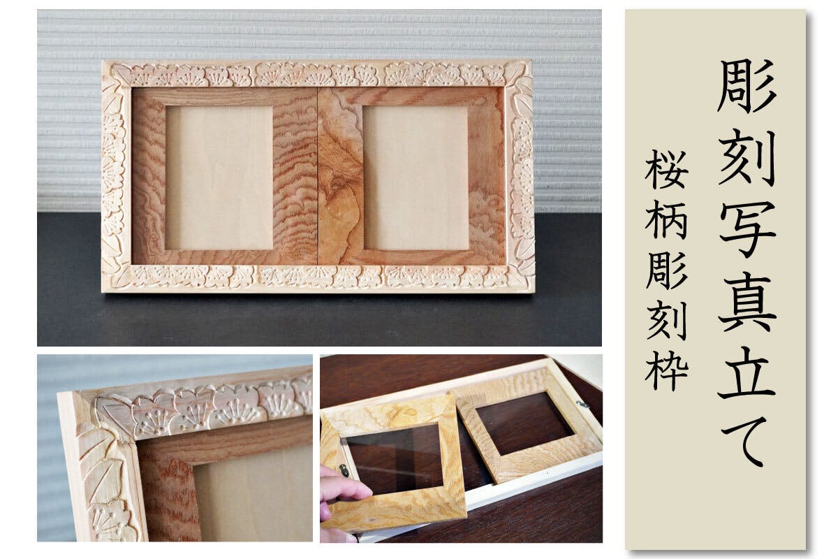 木製の写真立てに桜柄の彫刻を施しました。枠はヒノキで、写真をはめる部分はケヤキになります。