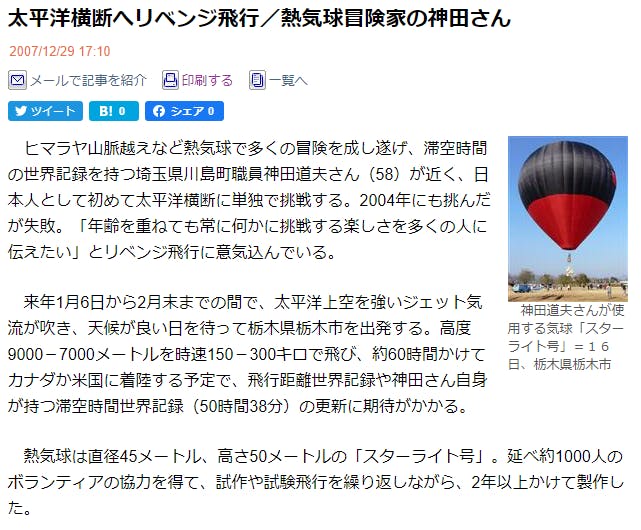 ヒマラヤ山脈越えなど、熱気球で多くの冒険を成し遂げ、滞空時間の世界記録を持っておられます。2008年に太平洋横断に単独で挑戦し帰らぬ人となりましたが、「年齢を重ねても常に何かに挑戦する楽しさを多くの人に伝えたい」 という彼のメッセージを、私も受け止めた一人だったと思います。