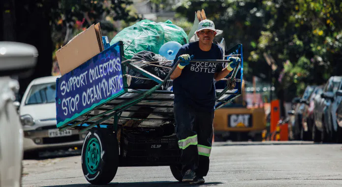 アイデアの元は人々です:オーシャンボトルはプラスチック回収者のエコシステムに寄付を行っています。IBMブロックチェーンシステムを通して回収されたプラスチックに対し従来の最高3倍のレートで支払います。このインパクトは3重になります:海に流れ込むプラスチックの減少、貧困の減少、新たなプラスチックへのニーズを減らし回収されたプラスチックで回る経済の構築です。
