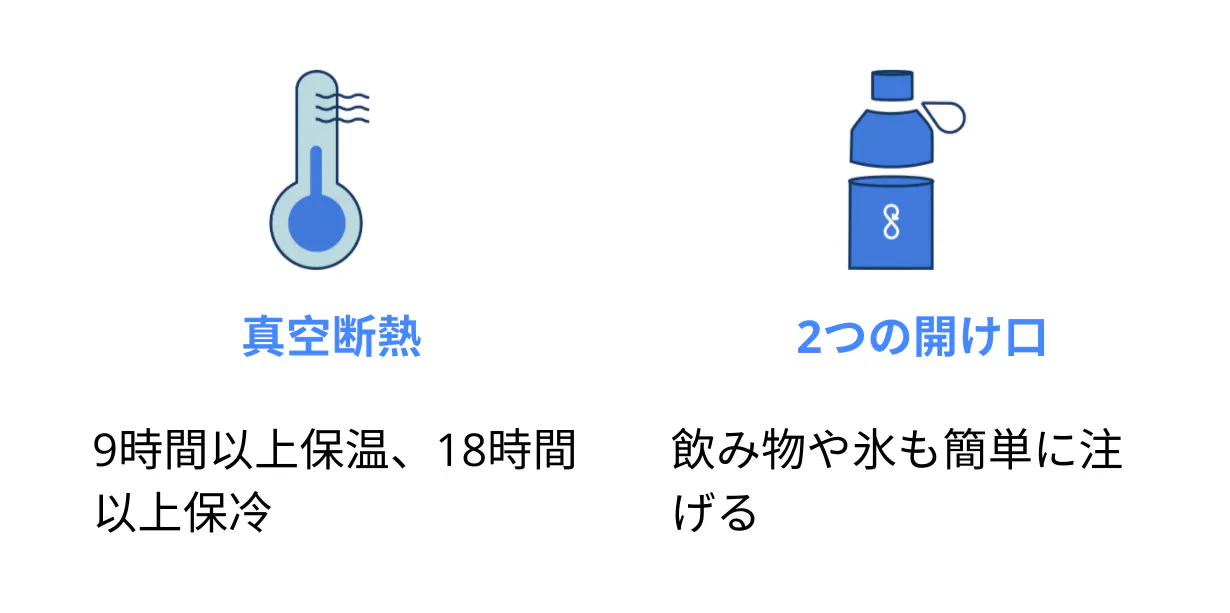 二つの開け口により、簡単に飲み物を注ぐことができます。冷たい飲みものは冷たいまま、熱いものは熱いまま保管することができます。