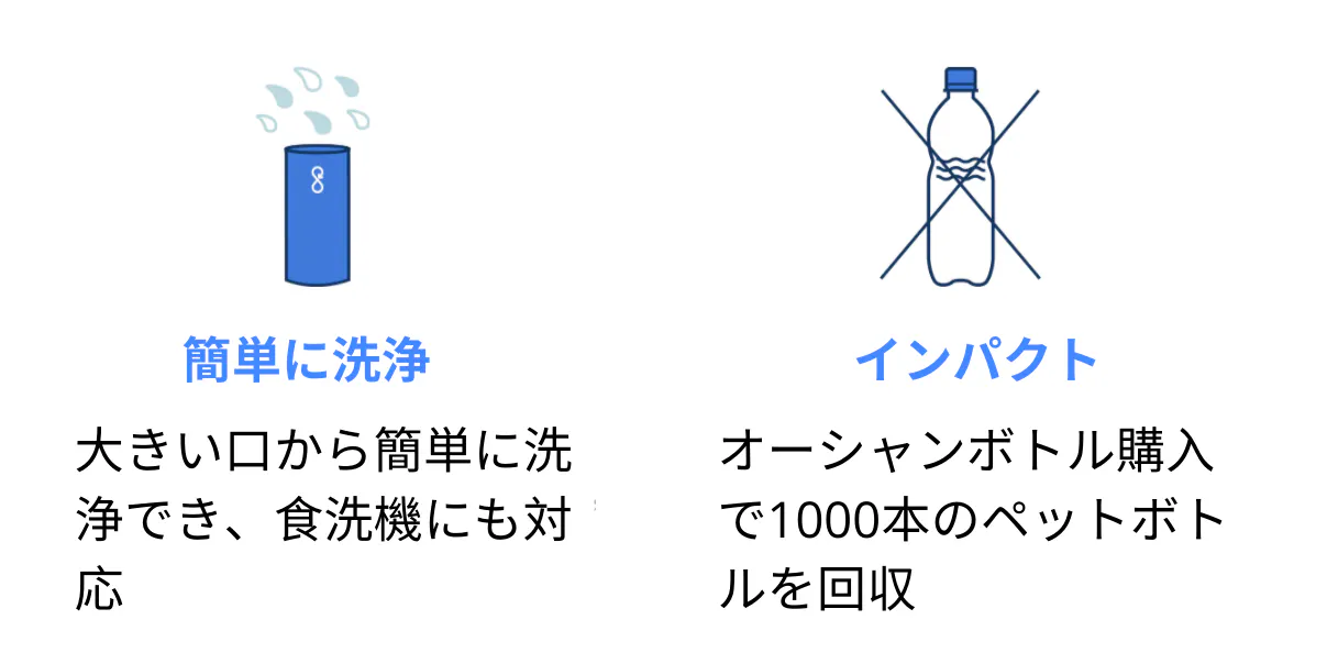 オーシャンボトルを1つご購入いただくと、1000本ものペットボトル - 海洋プラスチックゴミを回収する基金を集めることができます。また、ボトルはたった1つで繰り返し使用可能なボトルの最高の機能を兼ね備えています。