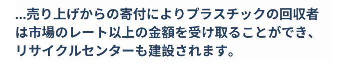 私たちはプラスチック・バンクと手を組んで、プラスチックが売れるように、そして新たな商品に生まれ変われるようリサイクルの基盤を作りました。ここではプラスチックの回収者は市場レート以上の金額を受け取るとこができます。