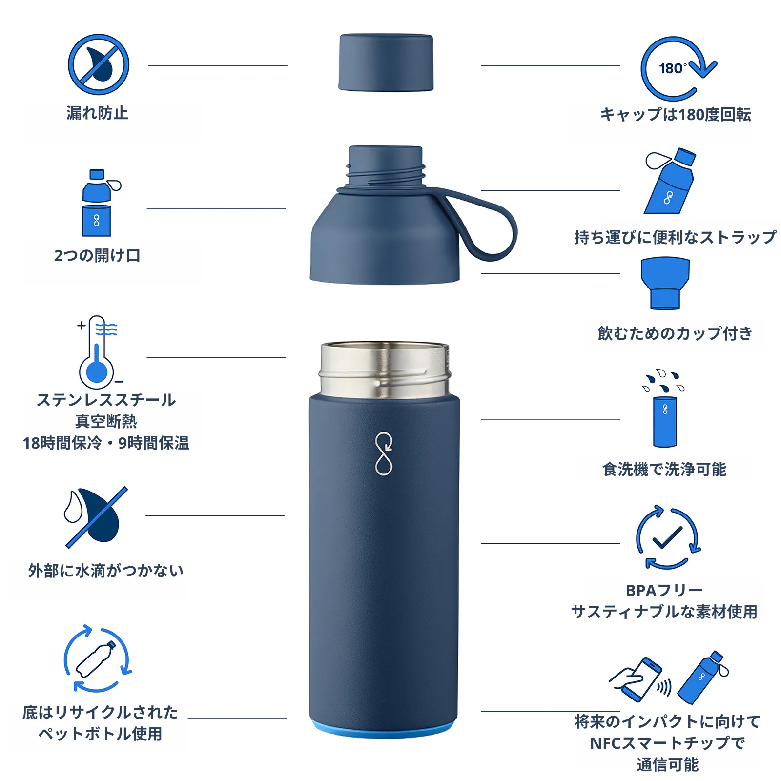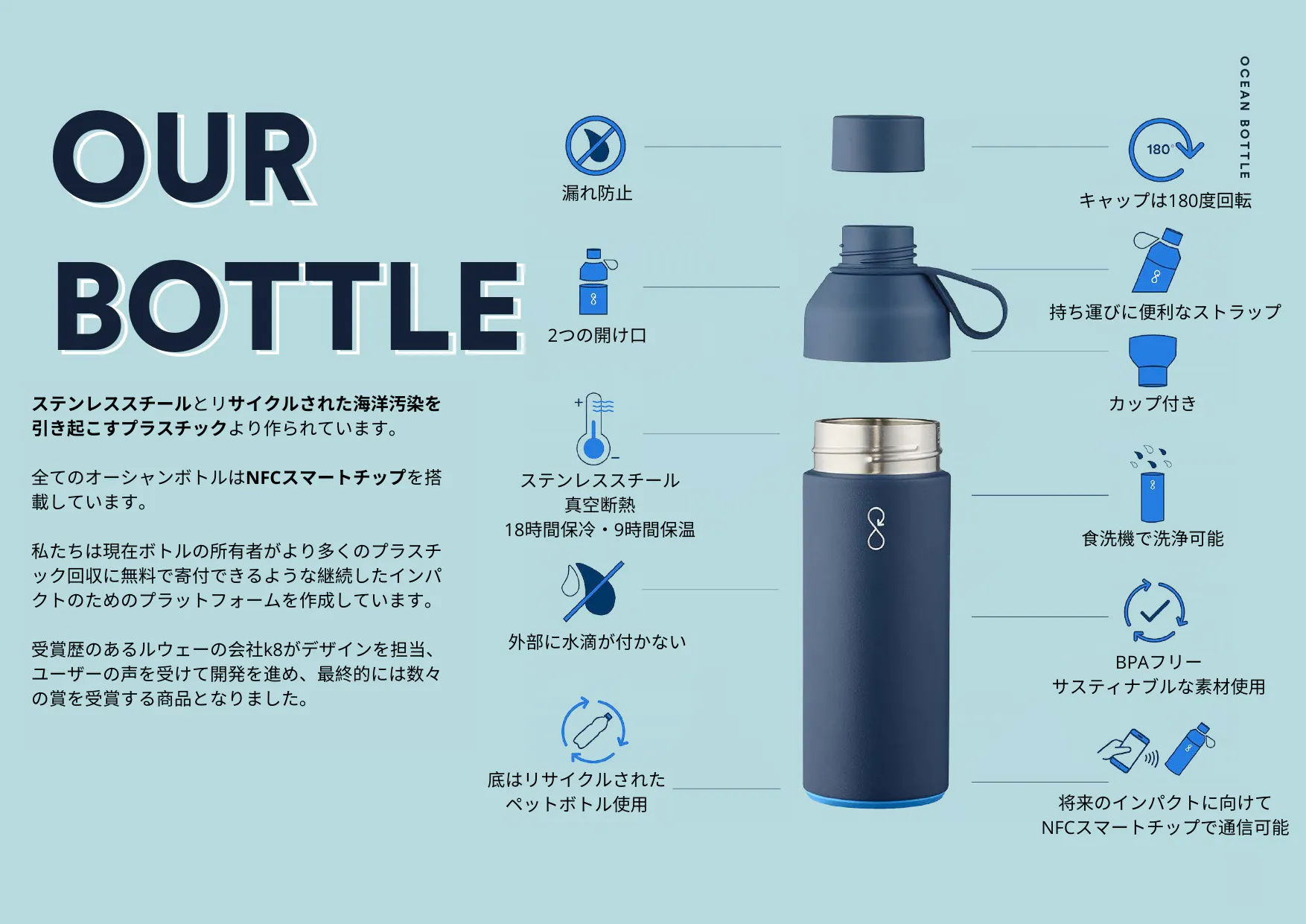オーシャンボトルはあなたが購入する最後の繰り返し使用可能なボトルとなるよう設計されています。私たちは受賞歴のあるノルウェーのデザイン会社K8とパートナーを組み、存在する様々な革新的な機能を備えた最高の機能を持つ500mlのボトルを作りました。