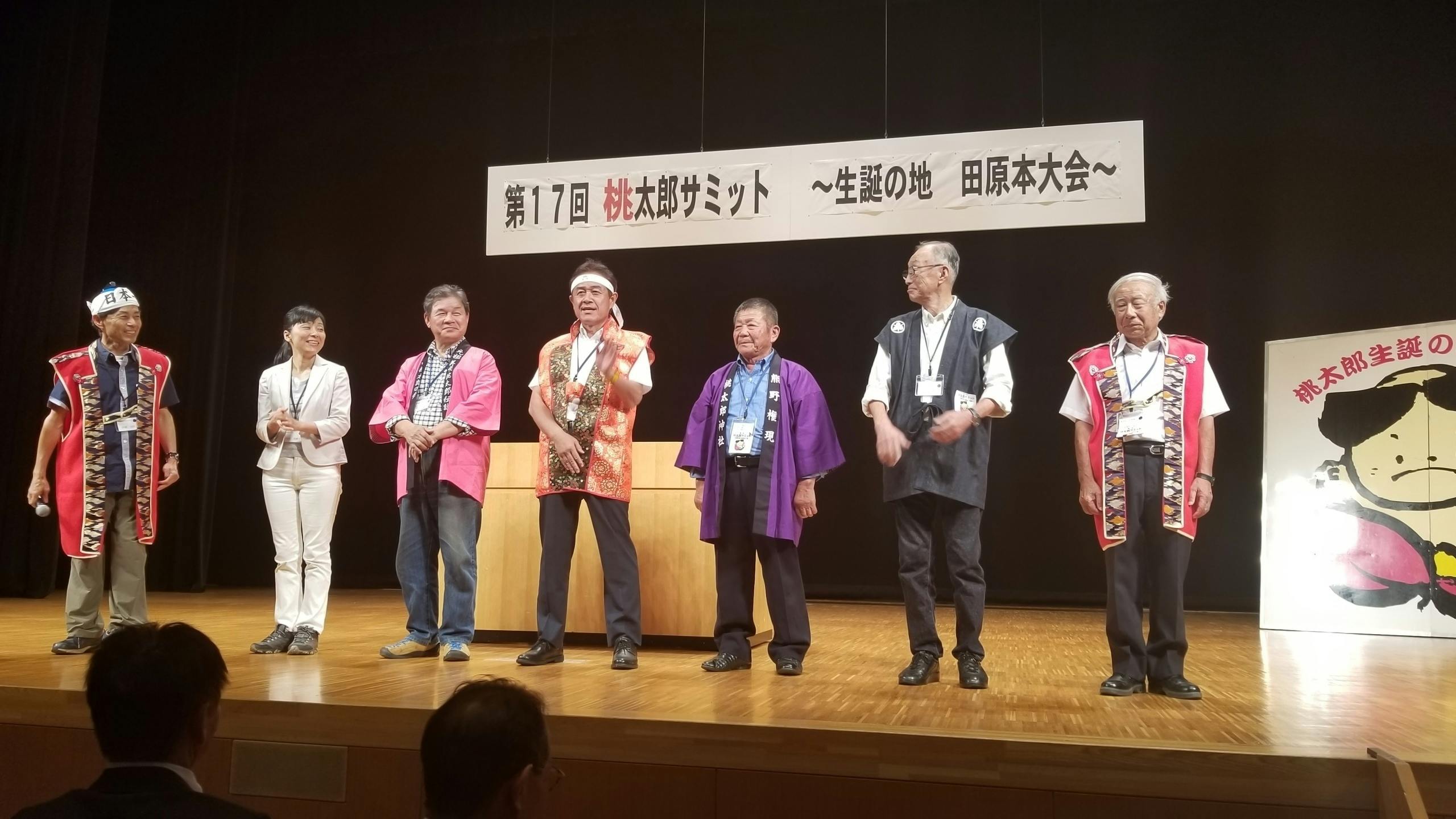 (写真は2019年奈良県田原本町で行われた第17回桃太郎サミット、中央は参加した小林大月市市長)