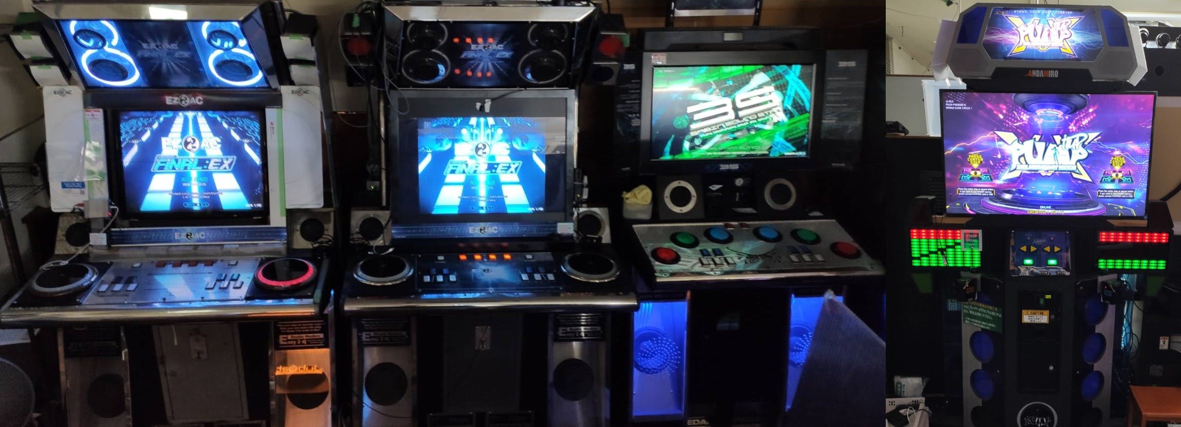 1998年に発売した音ゲーの原点beatmania。5鍵盤3台、そして後期に発売された上位シリーズbeatmaniaⅢ筐体。