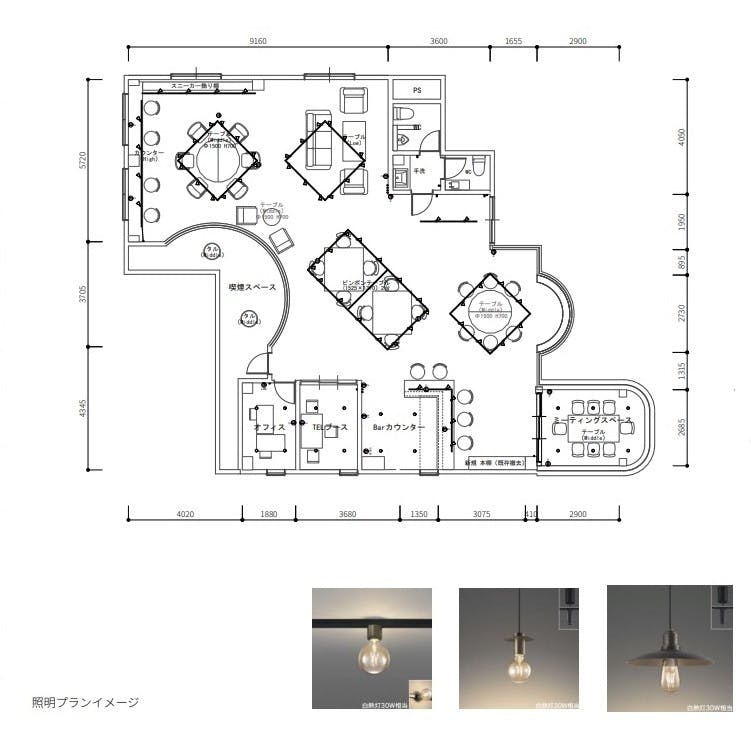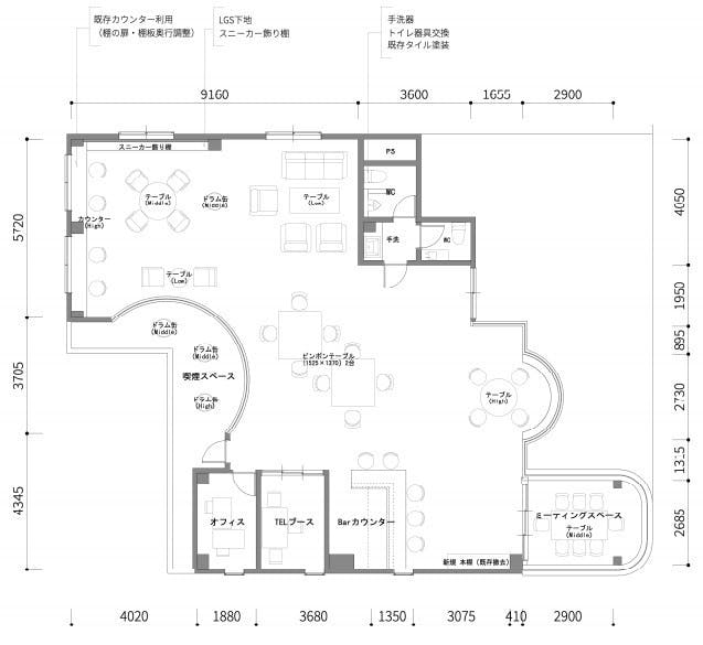 なので、テーブル席でもドラム型テーブルやピンポンテーブル、カウンターテーブル等色々な種類を取り揃えたいと考えています。また、ミーティングルームや撮影ブース、電話ブースも設けたいと考えています。スニーカーも飾っちゃいます!!