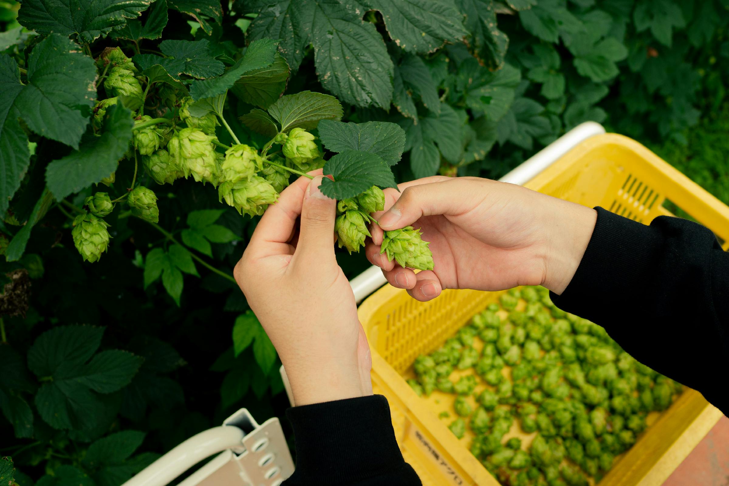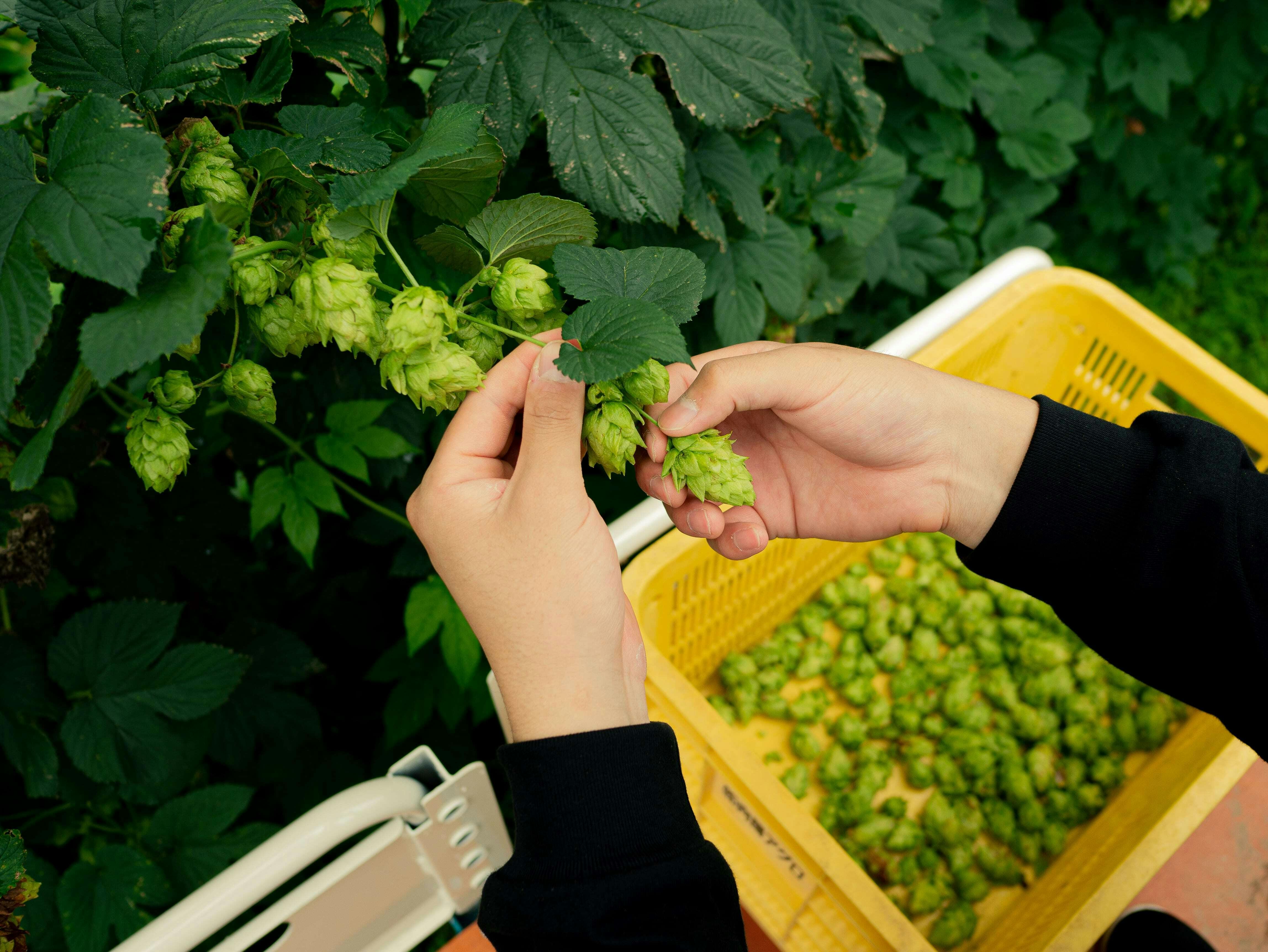 とれたてホップとは収穫したばかりで加工されていないホップのことを指し、ウェットホップとも呼ばれます。一般的に広く使用されている加工ホップでは感じることのできない、フレッシュで青々とした香りがとれたてホップにはぎゅっと詰まっています。