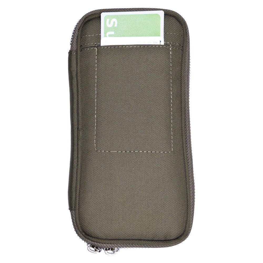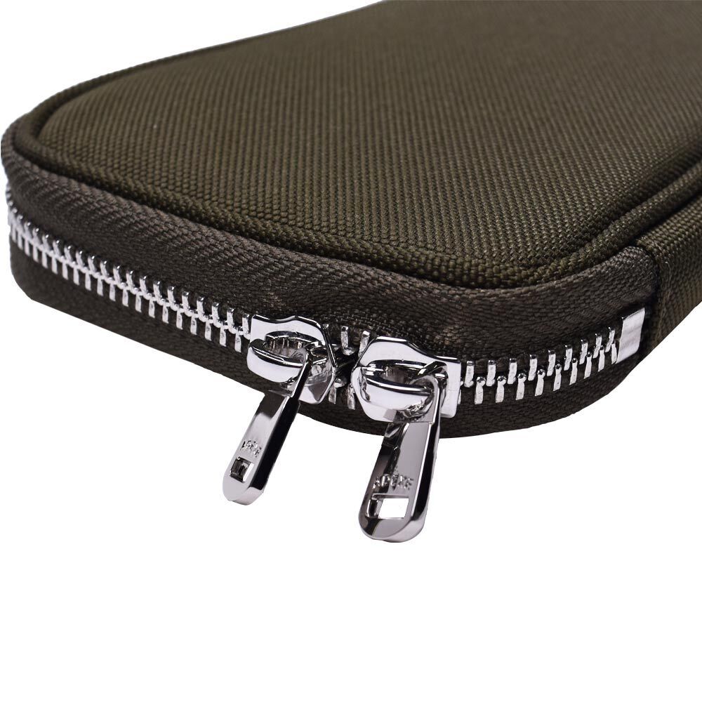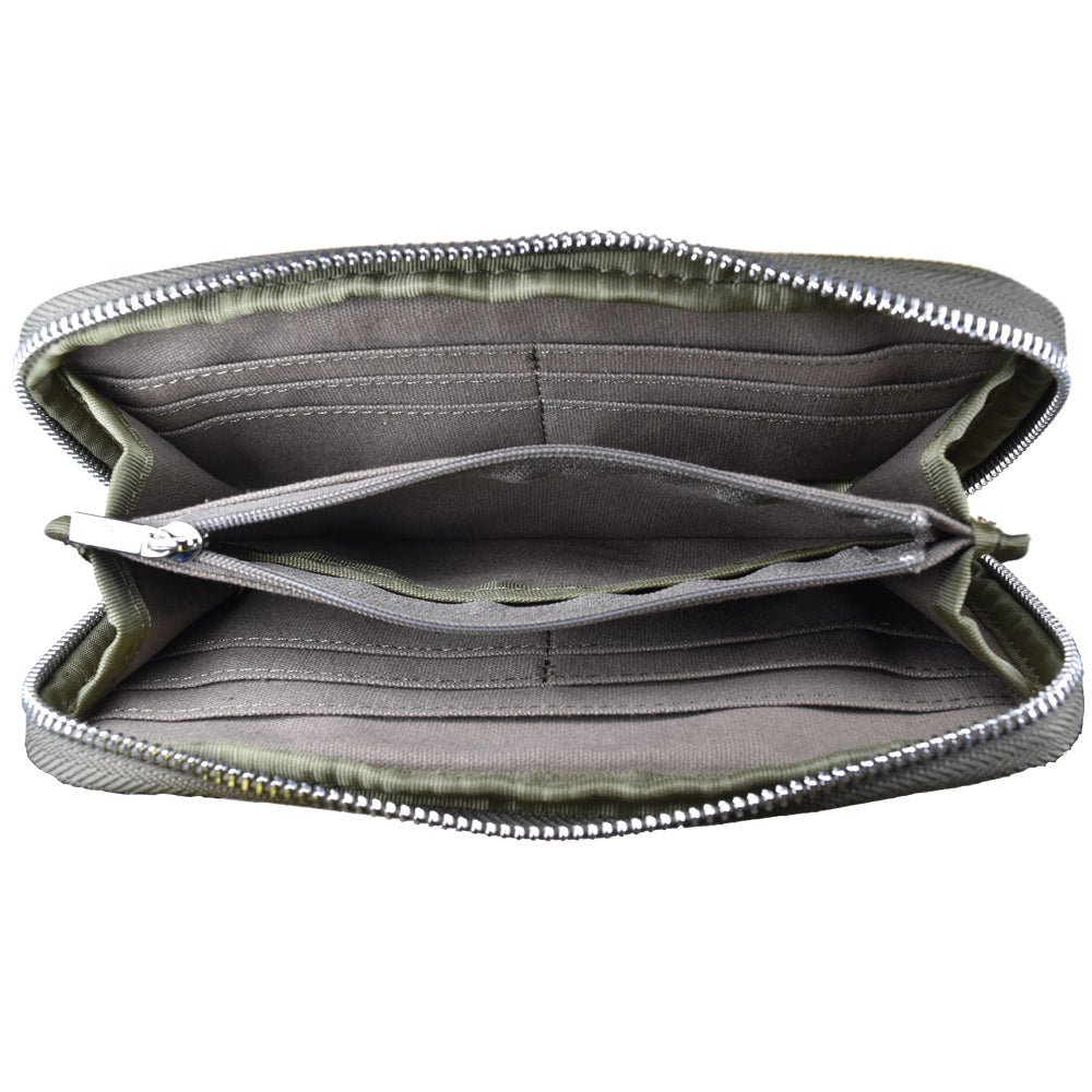 ファブリックウォレットの素材は、キャンバスになります。カードポケット×8、ファスナー式小銭入れ、ICカード用外ポケット×1、iPhoneなど標準的なスマートフォンが収納可能なサイズのため、ポーチとしてもお使いいただけます。