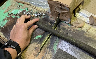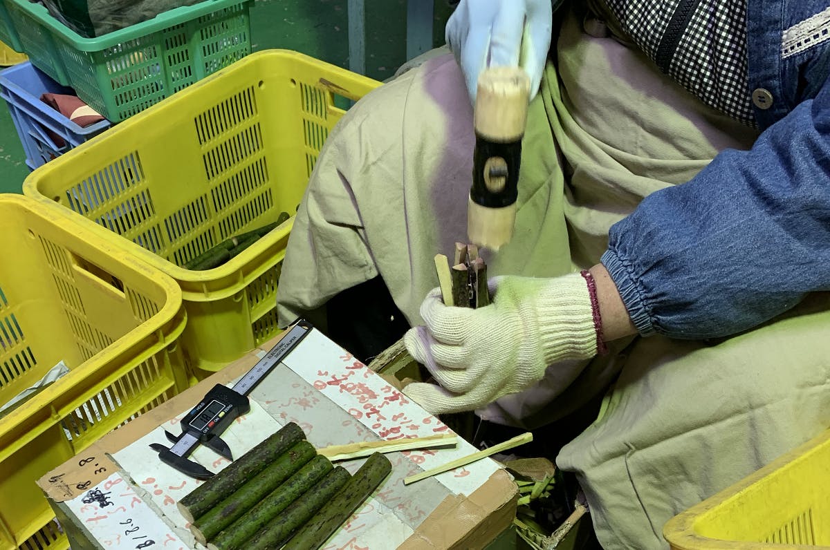 そこから割という作業に入ります。刃の付いた台にカットした黒文字を押し当てハンマーで叩き割ります。自然に生えた生木を割るということで木の筋、曲がりなどがあり機械化が難しく これも今でも手作業で仕上げていきます。
