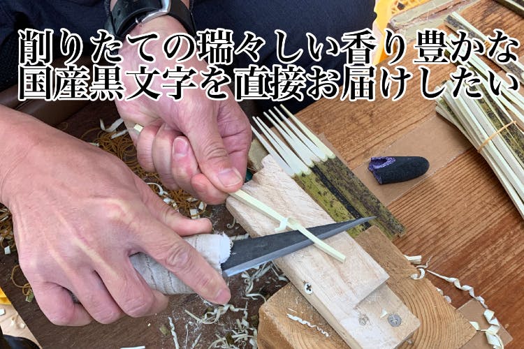 国産黒文字の原木の確保の難しさから、今回数量限定ですが国産の黒文字を使い削りたての黒文字箸、菓子ようじをお客様に直接お届けできる事をとても楽しみに思っております。出来立て削りたての黒文字の瑞々しさ香りをご堪能ください。心よりご注文お待ちしております。