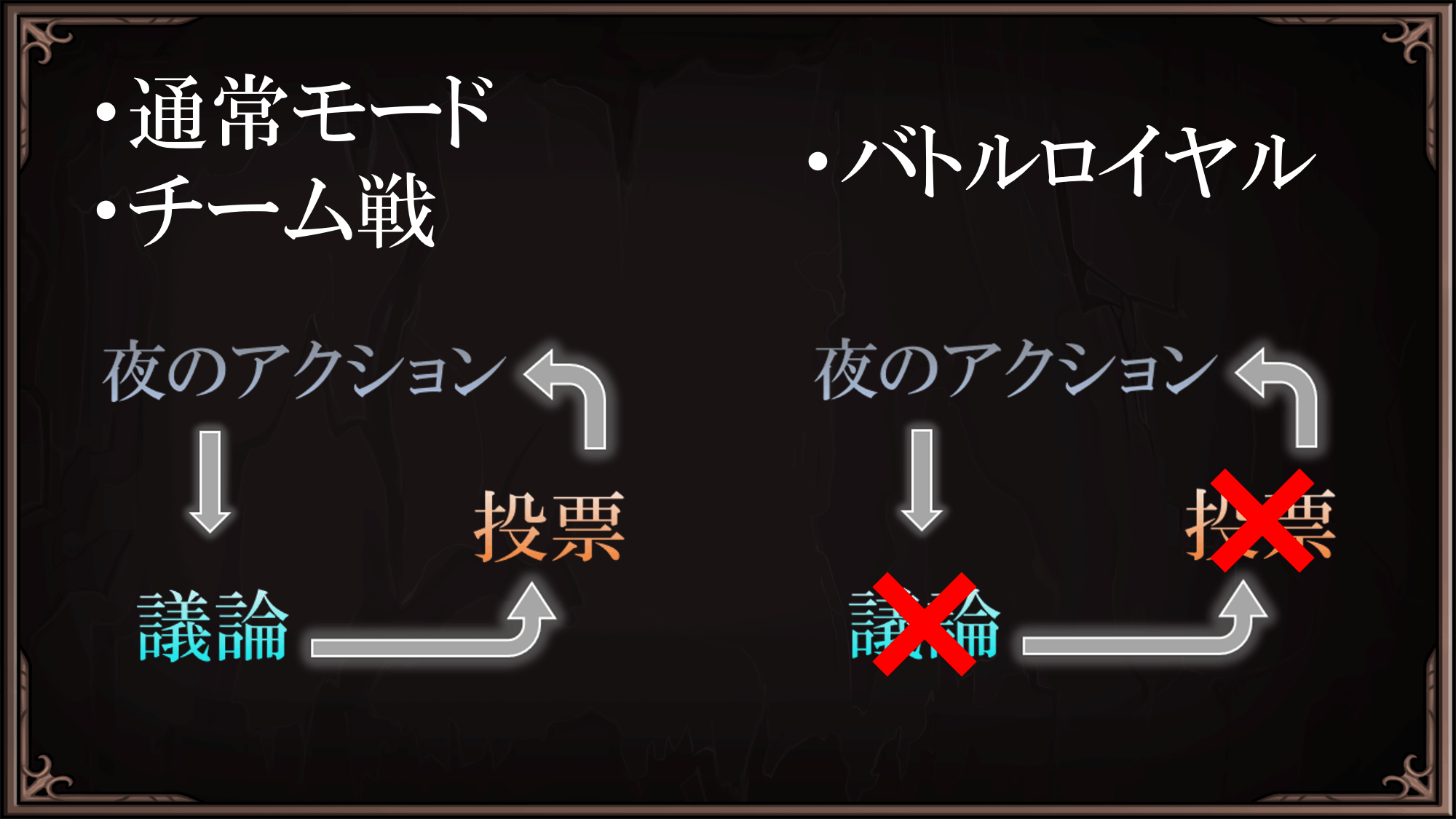 ・バトルロイヤル:夜の行動だけを繰り返し最後の1人になるまで続ける、戦闘重視のモード