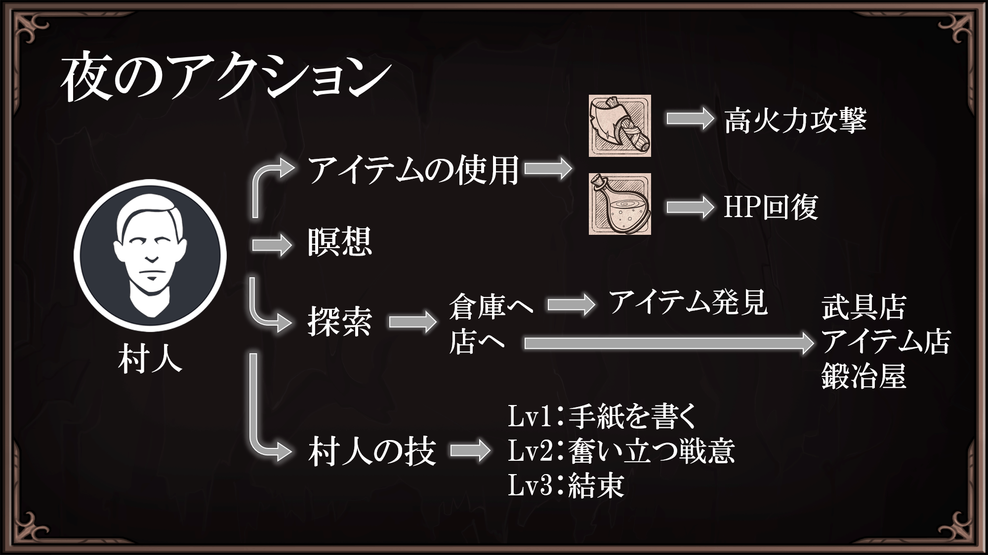 夜にプレイヤーが取れる行動は非常に幅広く、所持しているアイテムの使用・外の探索といったコマンドは役職に関係なく実行することができます。