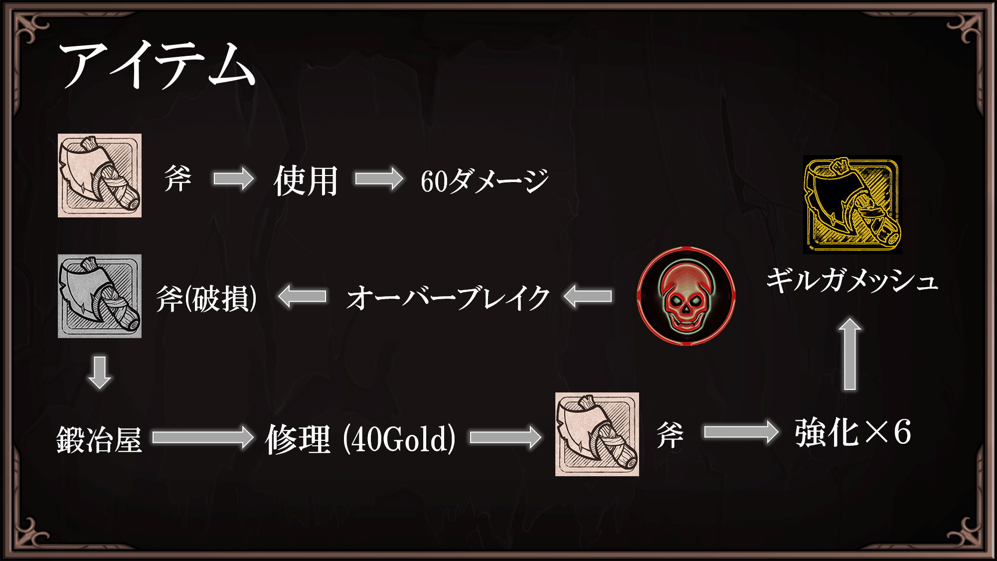 戦闘能力の低い「村人」も「斧」を持てば高い火力での攻撃ができ、鍛冶屋で「斧」を強化し更に火力を上げたり、多くの選択肢を持ちます。