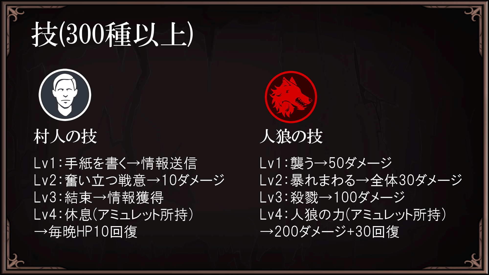 ・通常モード:「村人陣営」「人狼陣営」に分かれ、夜の行動→議論→投票→夜の行動、と繰り返す