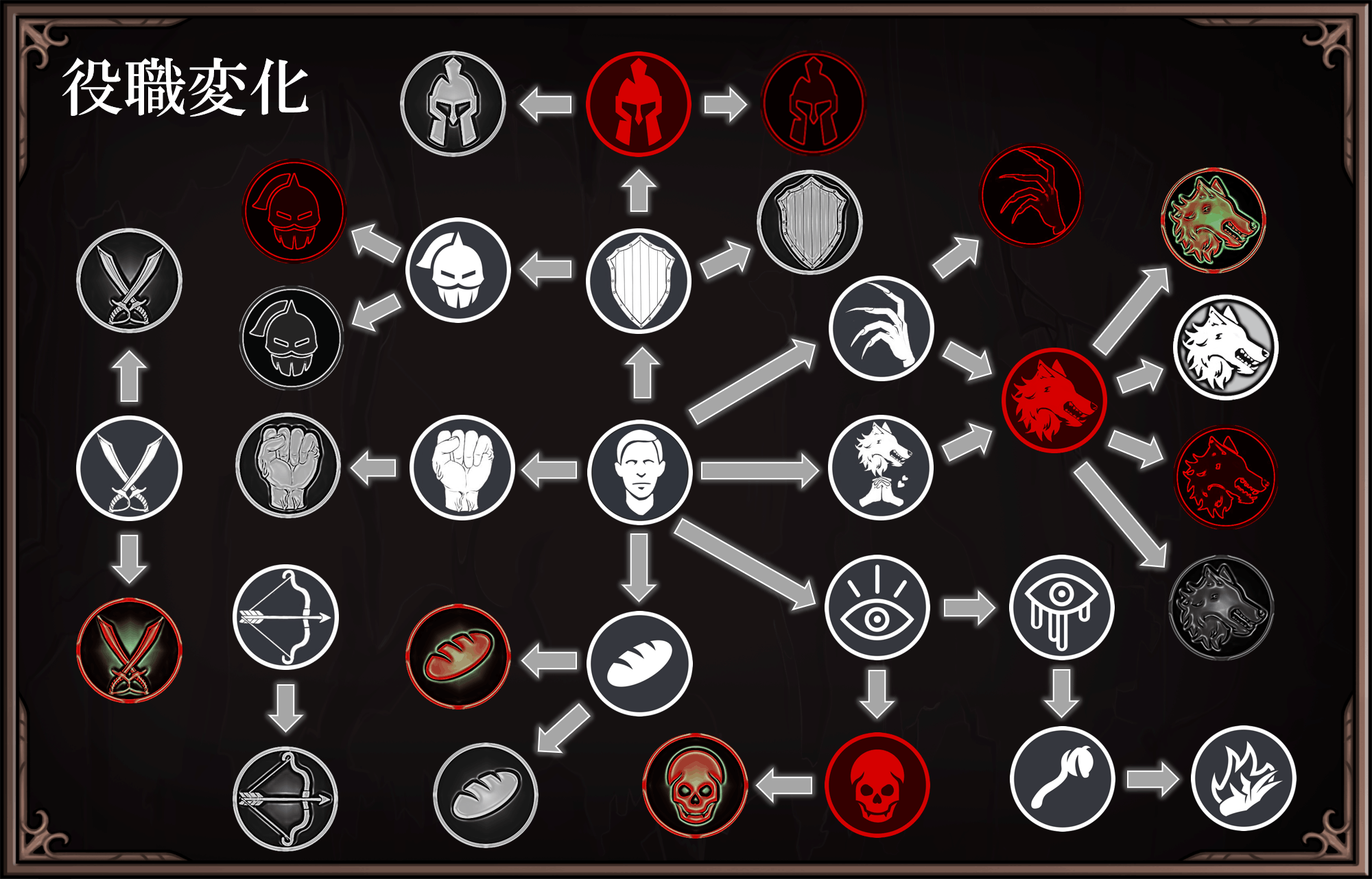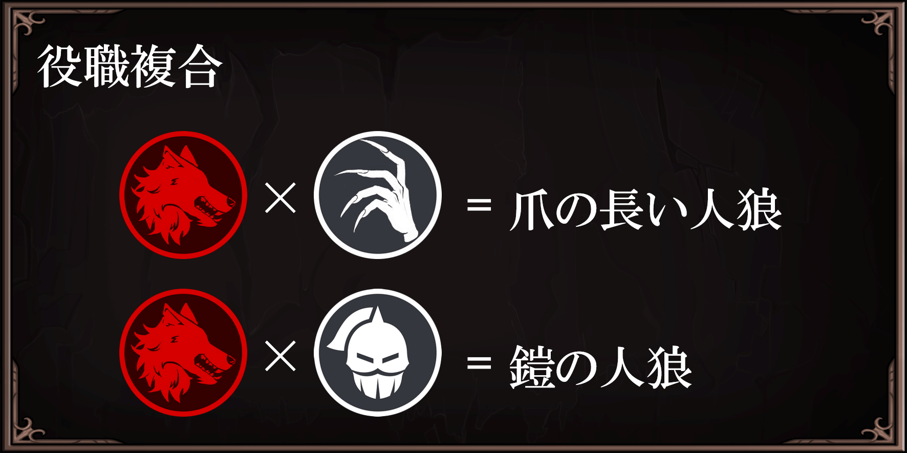 この人狼ゲームでは、人狼陣営に選ばれたプレイヤーが2つの役職を保有します。2つの役職は複合され、役職名が決定されます。