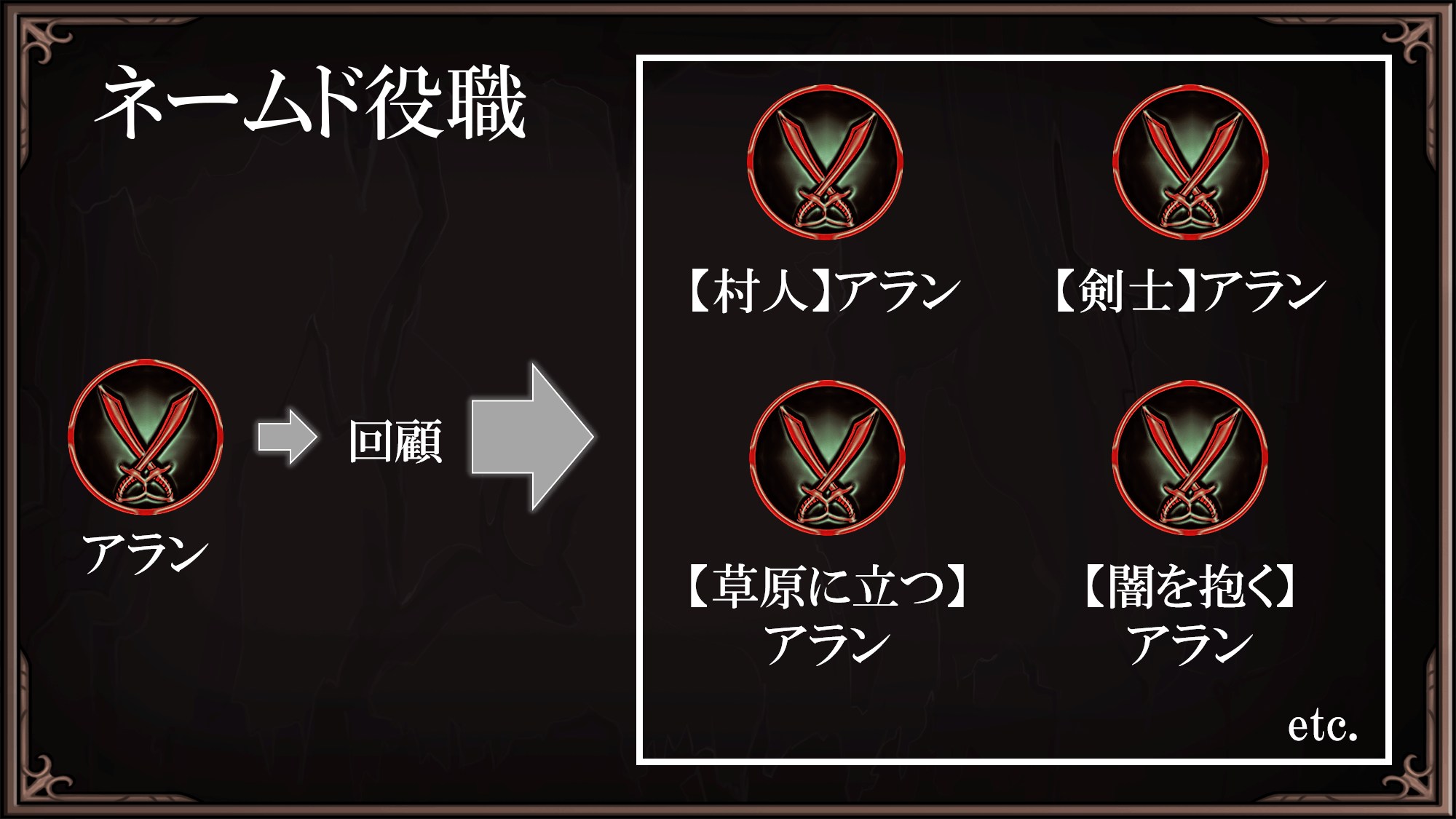 ネームド役職になると「回顧」コマンドが開放され、二つ名を持つことができます。二つ名を持つことで技を習得したり、特性が付与されます。二つ名一覧