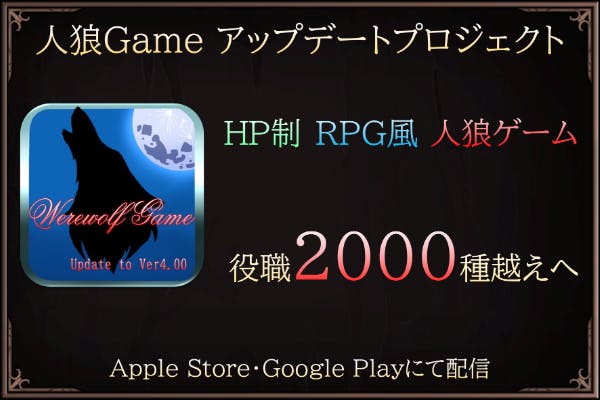 このプロジェクトは、現在Apple Store・Google Playにて配信中のアプリ「人狼バトルロイヤルOnline」のVer4.00大型アップデート開発を目的に発足しました。