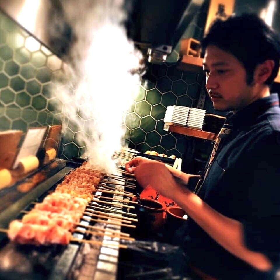 【山形料理と焼き鳥の店「月山」で焼き台に立つ齋藤太一さん】