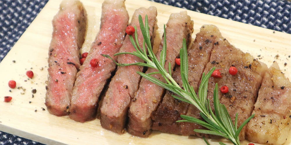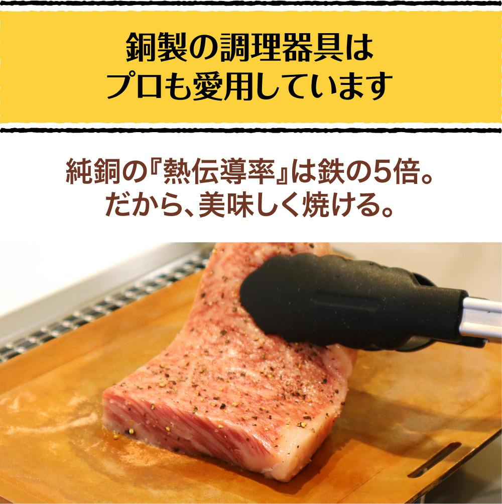 純銅素材なら分厚いステーキ肉を焼く場合でも強火は不要、弱火や中火でじっくりと焼けるので、表面はしっかりと焼き色が付き中身はレアで火が入ります。