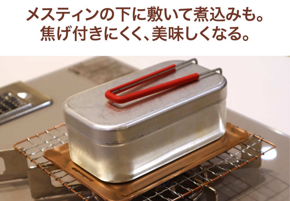 お肉を焼くだけではなく、メスティンで調理する際に下に敷いて使えば、底面全体に熱が伝わるので、炊飯や煮込み料理が焦げ付きにくくなります。