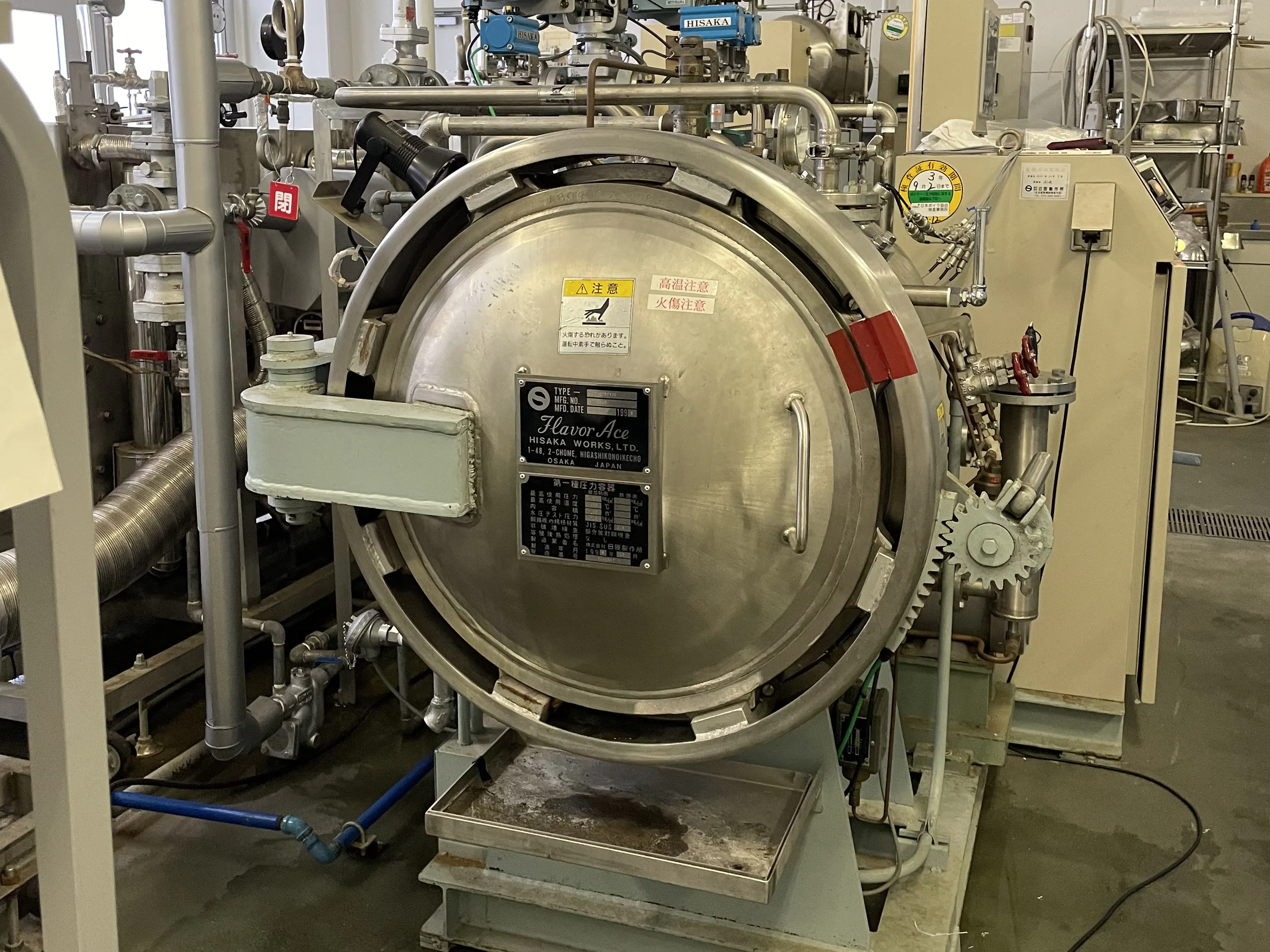 ※写真はレトルト食品を加熱殺菌する機械です、実際に加熱殺菌を試験的に行い味見をしながら香りのバランス、食感などを調整してます。