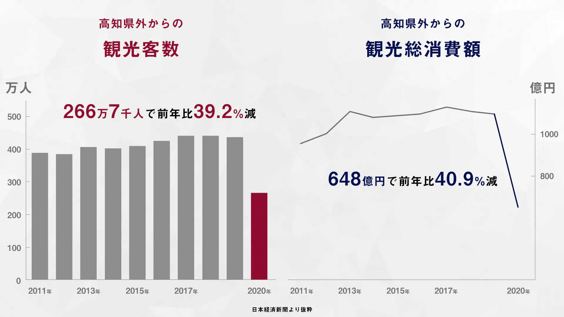 "2020年に高知を訪れた県外観光客は266万7千人で前年比39.2%減。現在の集計手法になった03年以降で最も少ない結果。新型コロナウイルス感染拡大の影響が大きく、総消費額も648億円(同40.9%減)で最少でした。(日本経済新聞より抜粋)"