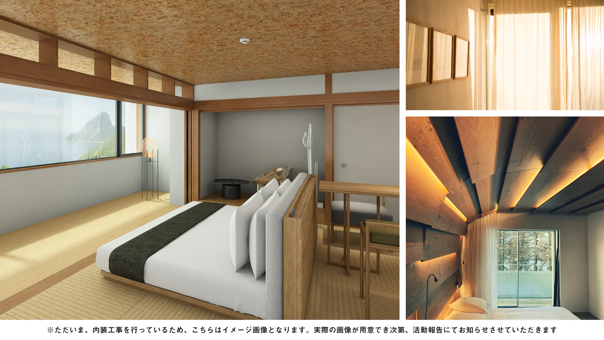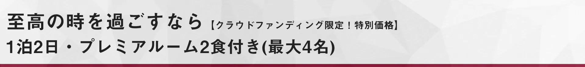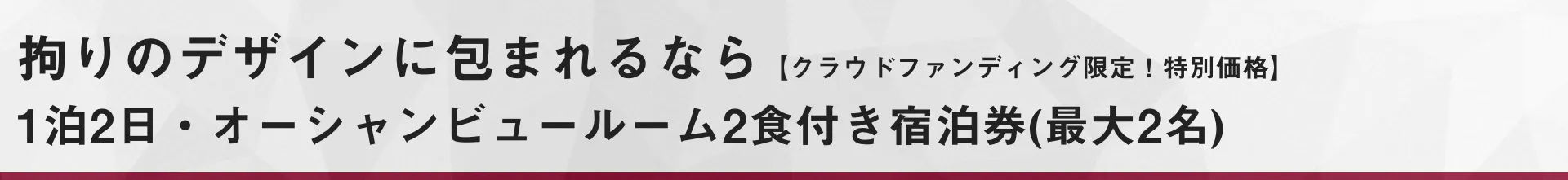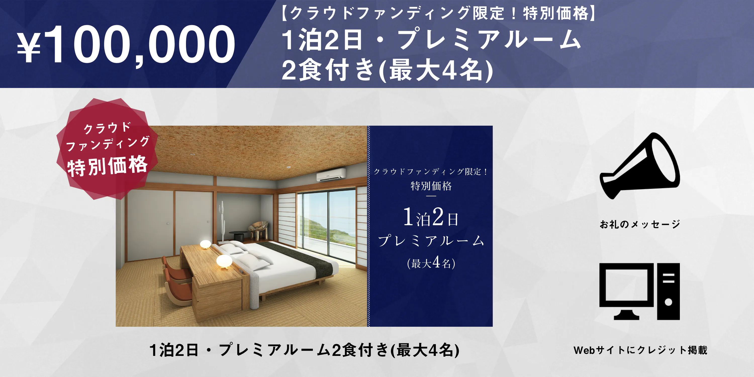 全プラン、クラウドファンディング限定の特別価格となっております。また、各プラン2泊3日の宿泊券もご用意しており、更にお得なお値段となっております。全部屋、五感と心のスイッチを押す拘りのデザインが施され、お食事は朝夕、高知県の旬の食材を使用したお料理を施設内レストランにてお召し上がりいただけます。