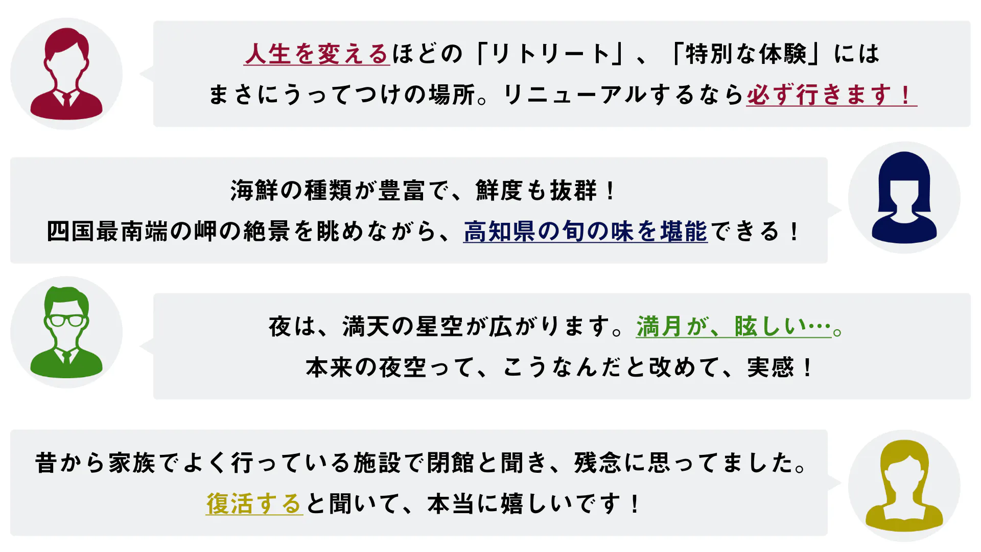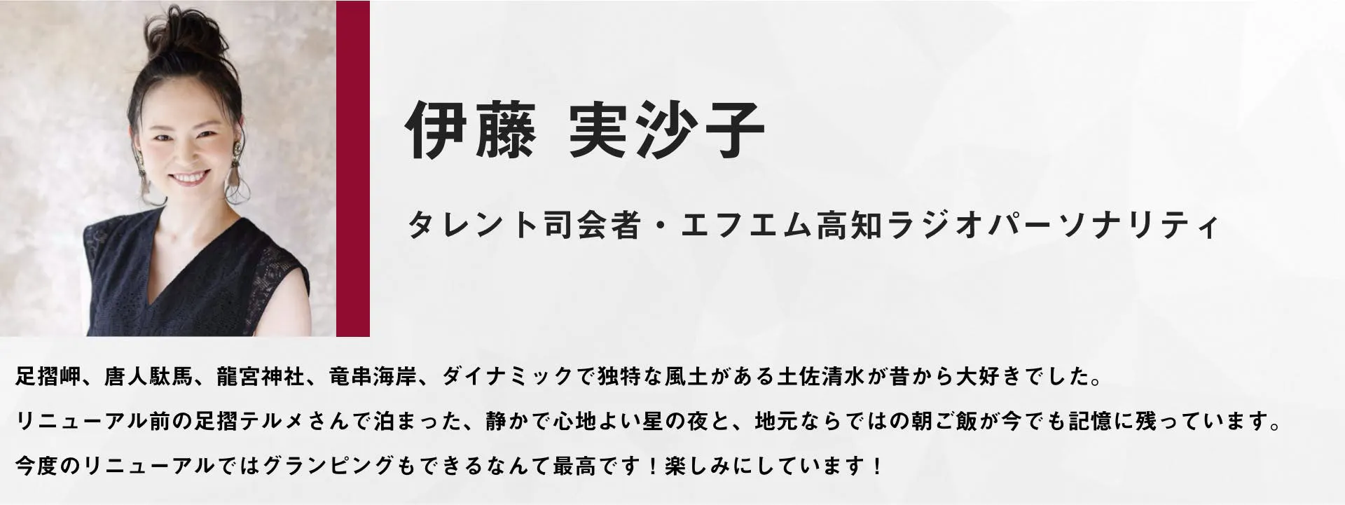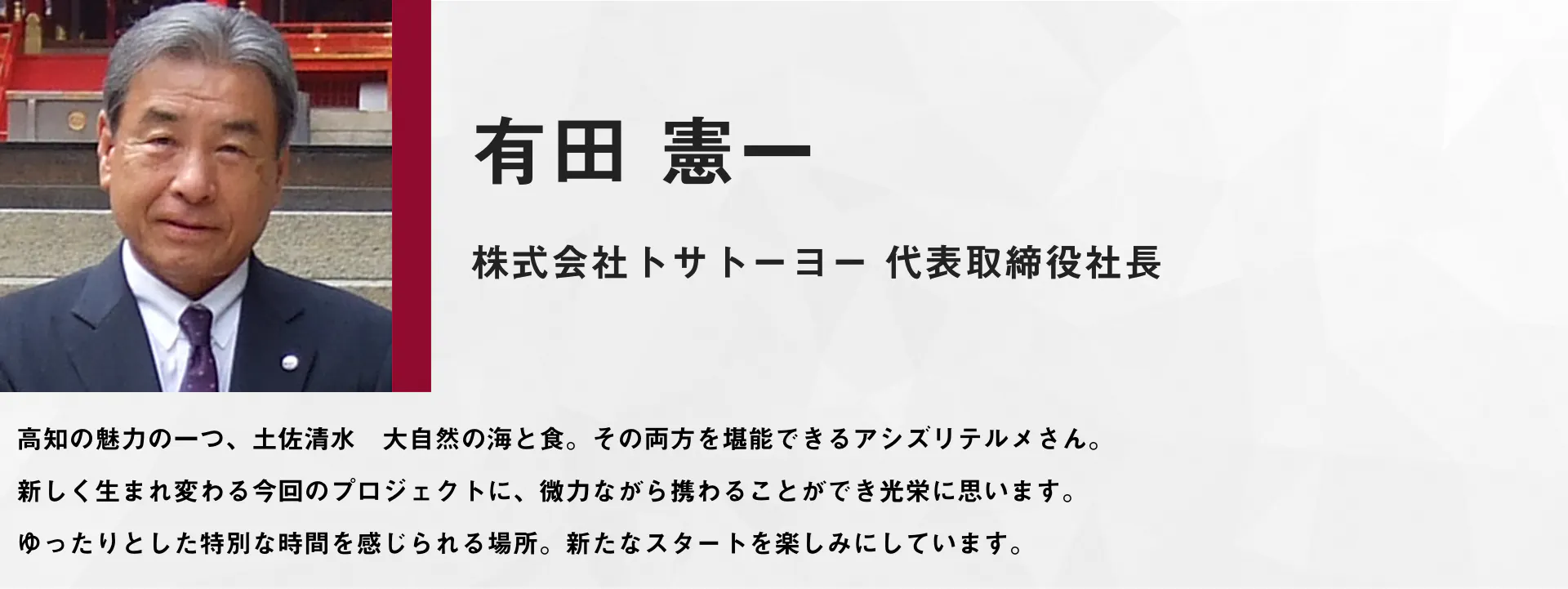 この「アシズリテルメ」は、閉館以前からの根強いファンの方も多く、土佐清水市の「誇り」とも言われる施設です。そのような施設の指定管理者を拝命したことはとてもありがたく、同時にプレッシャーも感じていますが、「アシズリテルメ」と高知県を愛するみなさんの想いを大切に、任務を成し遂げたいと思っています。