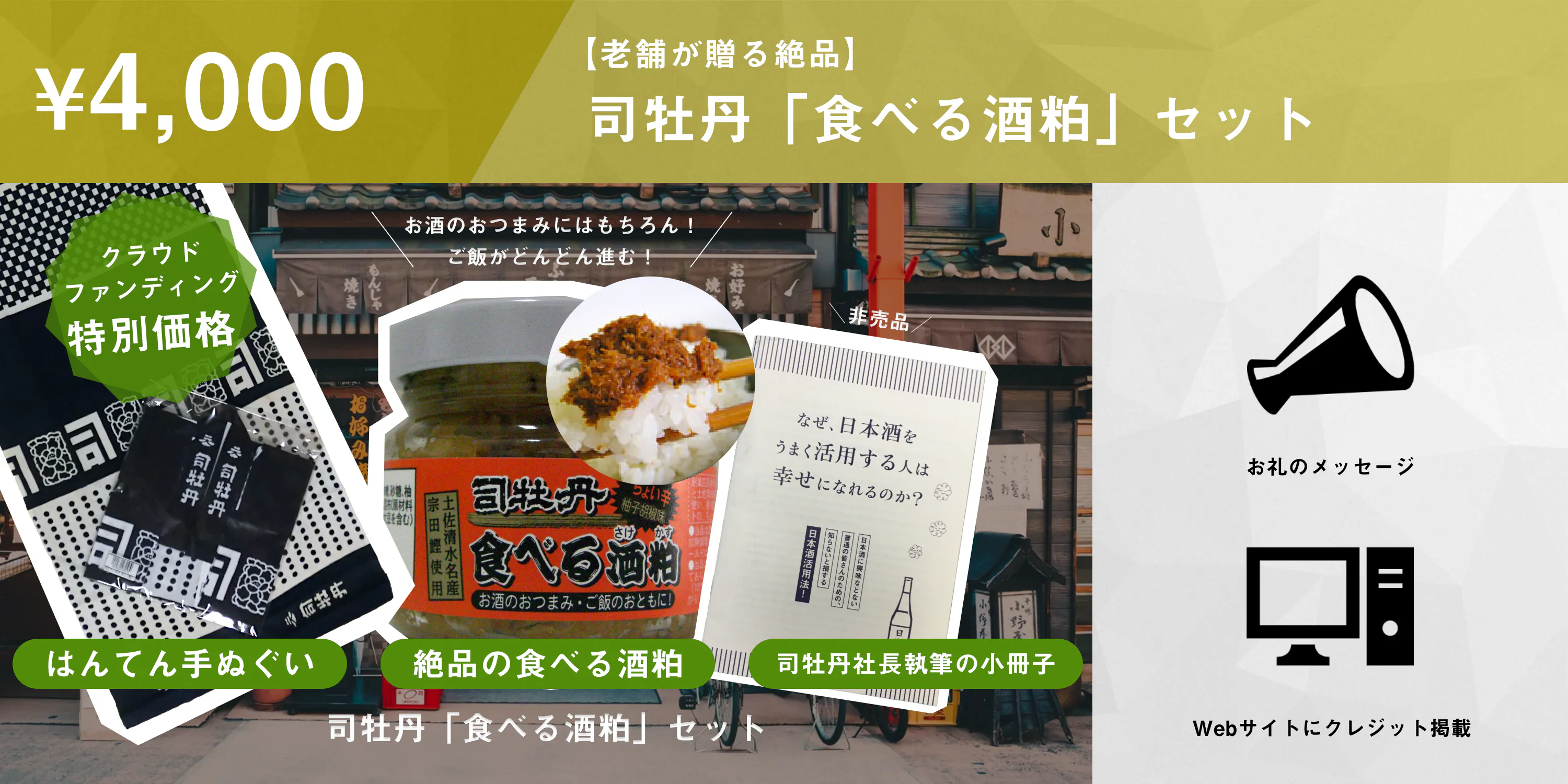 慶長8年(1603年)に創業、高知県の老舗酒造会社『司牡丹酒造株式会社』との特別コラボによるクラウドファンディング限定、人気商品「司牡丹・食べる酒粕」セットです。坂本龍馬も飲んだといわれる土佐の代表的銘柄「司牡丹(つかさぼたん)」の酒粕に、土佐清水の特産品である宗田鰹と宗田節、アクセントに柚子胡椒を加えた絶品の「司牡丹・食べる酒粕」に、非売品の司牡丹社長執筆の小冊子「なぜ、日本酒をうまく活用する人は幸せになれるのか?」と、可愛らしい「はんてん手ぬぐい」をつけた、このクラウドファンディング限定、大盤振る舞いな特別セットです。