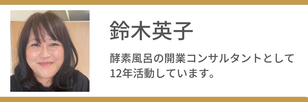 皆さまはじめまして。酵素風呂の店舗開業コンサルタントをしております、鈴木英子と申します。