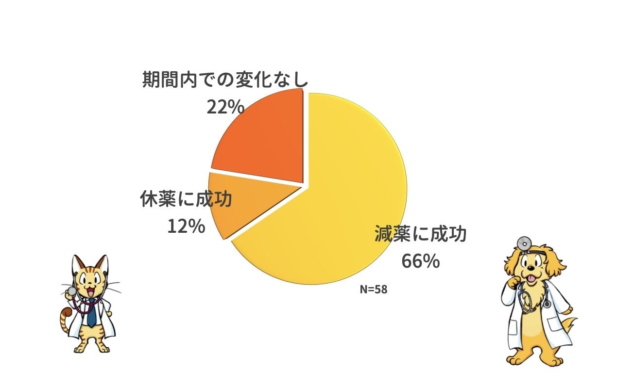私のクリニックでも、ADの犬を対象にケストースの給与を行いました。その結果、ケストースの給与8〜12週後に、約66%(38/58)の症例が減薬に成功しました。驚くべきことに、約12%の症例は休薬することができました。これが腸活製剤の凄さを知るキッカケになりました。