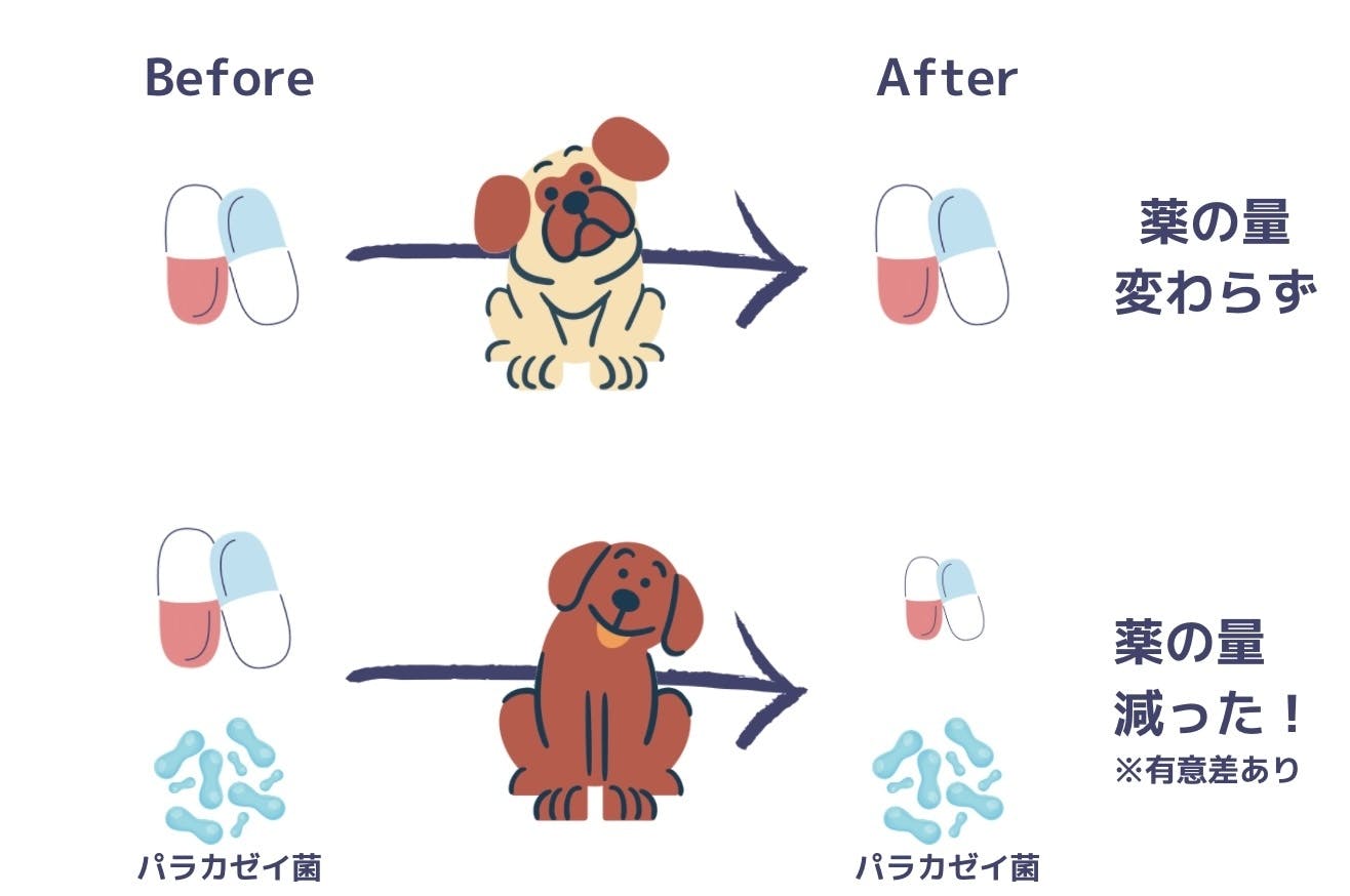 ADの犬に対してパラカゼイ菌を投与した研究も報告されています。ステロイド剤など薬物で継続加療されていたADの犬を対象に12週間パラカゼイ菌を投与した結果、投与群は非投与群に比較すると、有意に減薬できたことが示されています。