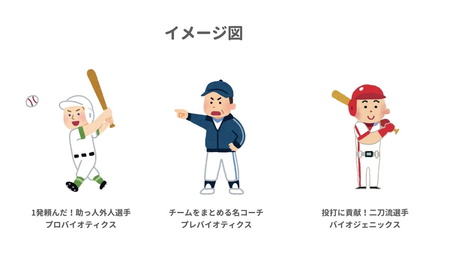 腸内細菌のバランスを改善する生きた菌のことです(ヨーグルトなどが有名)。プロ野球で例えるなら、「助っ人外国人選手」です。チームの勝利に貢献してくれる一方、チームにずっとは残ってくれません。
