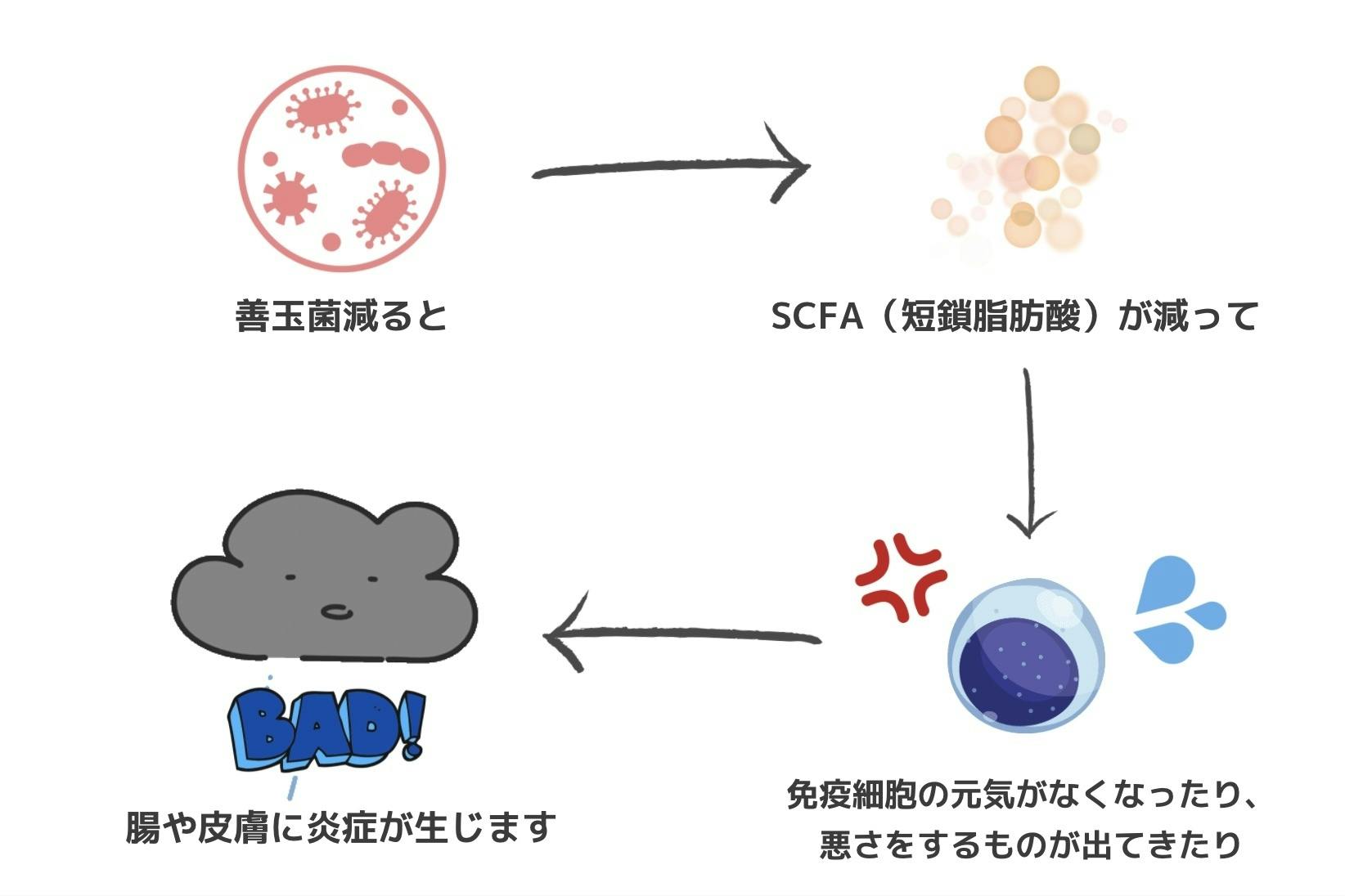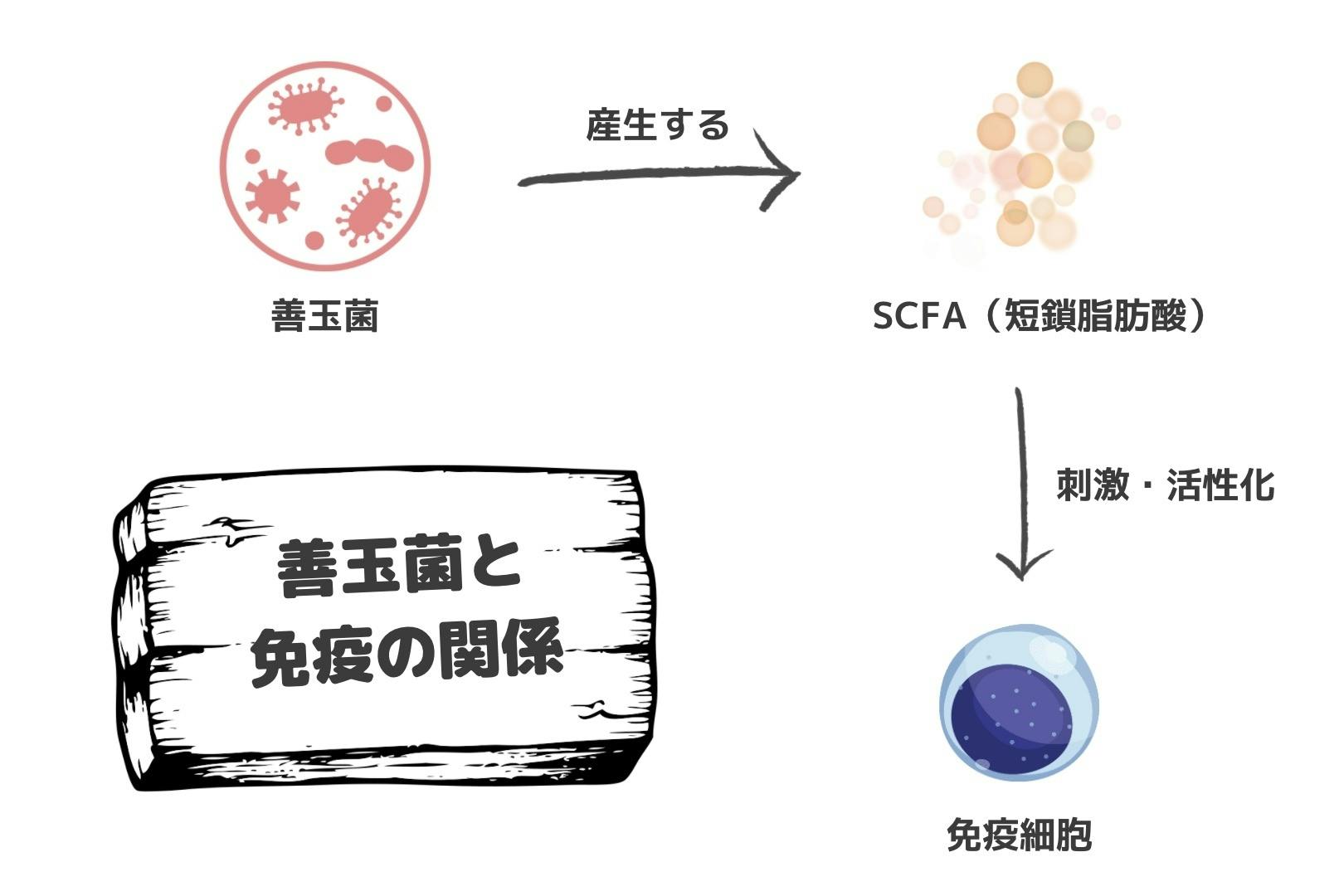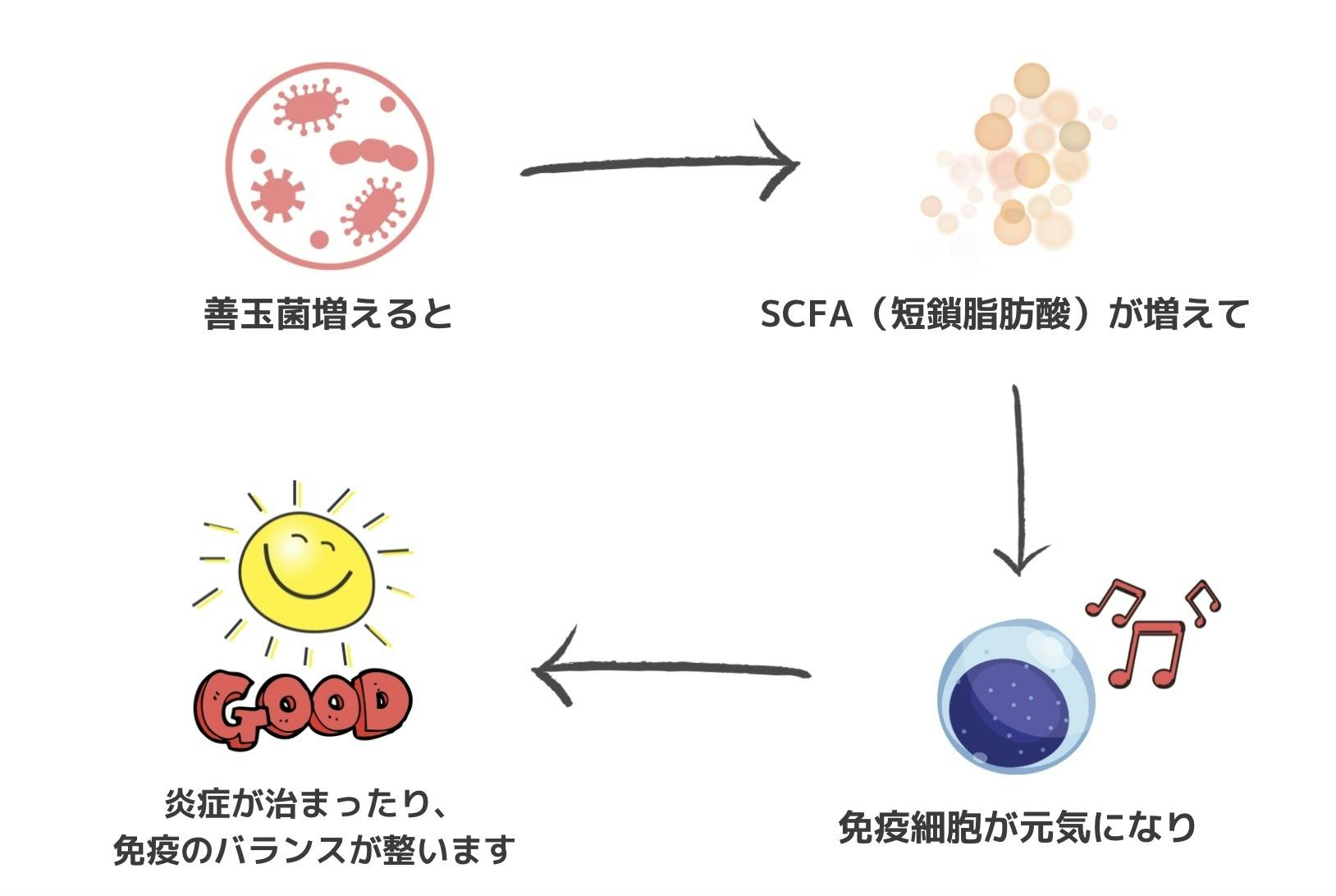 SCFA(酪酸、酢酸、プロピオン酸など)は、腸内細菌叢が豊かな状態で、主に善玉菌によって産生されます。そして、SCFAは免疫担当細胞に働きかけ炎症反応をおさめてくれる等、免疫機能に好影響を与えてくれます。