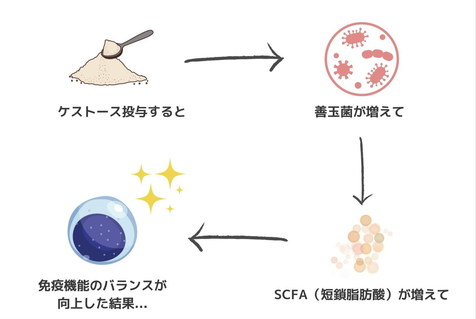 人ではADの患児にケストースを投与した結果、投与12週後の症状が未投与群に比較して有意に皮膚症状軽減したことが報告されています。