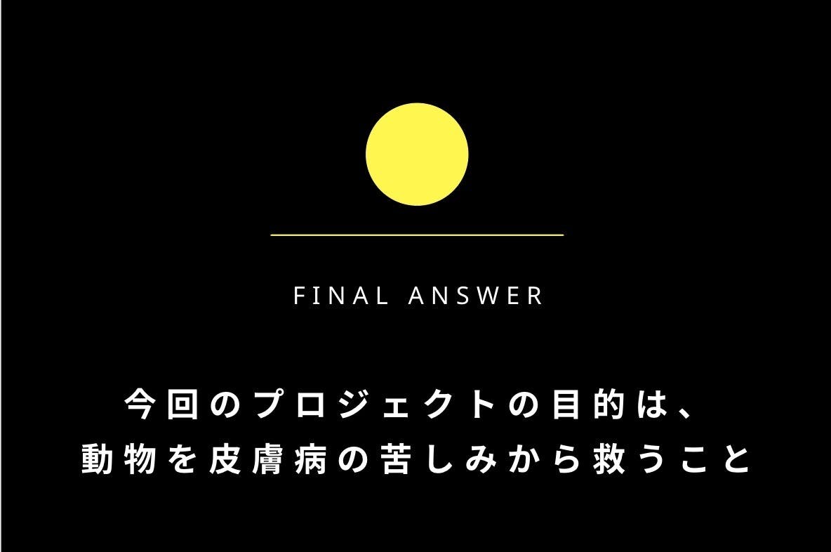 本プロジェクト・プロダクトの名前は共通で、FINAL ANSWER、としました。皮膚病や耳の病気で苦しむ動物たちとご家族の “最後の答え” になりたいという想いから名付けました。