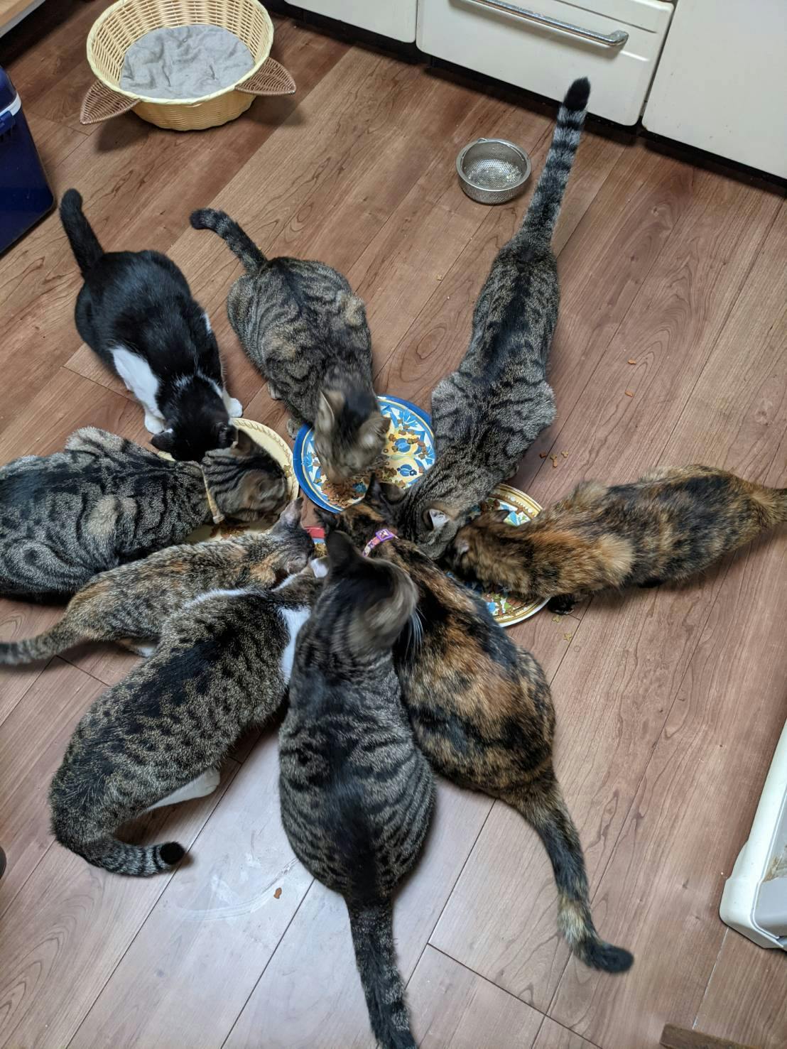 まだ目も空いていない子猫や、猫風邪から目がふさがりかけていた子もいました。怪我をしている子や病気の子の相談や保護も多く、医療費がかさんでいる状況です。三毛猫ちゃんの手術費用も捻出する事が、難しい状況です。三毛猫ちゃんを保護した辺りには、5匹の成猫さんもいます。