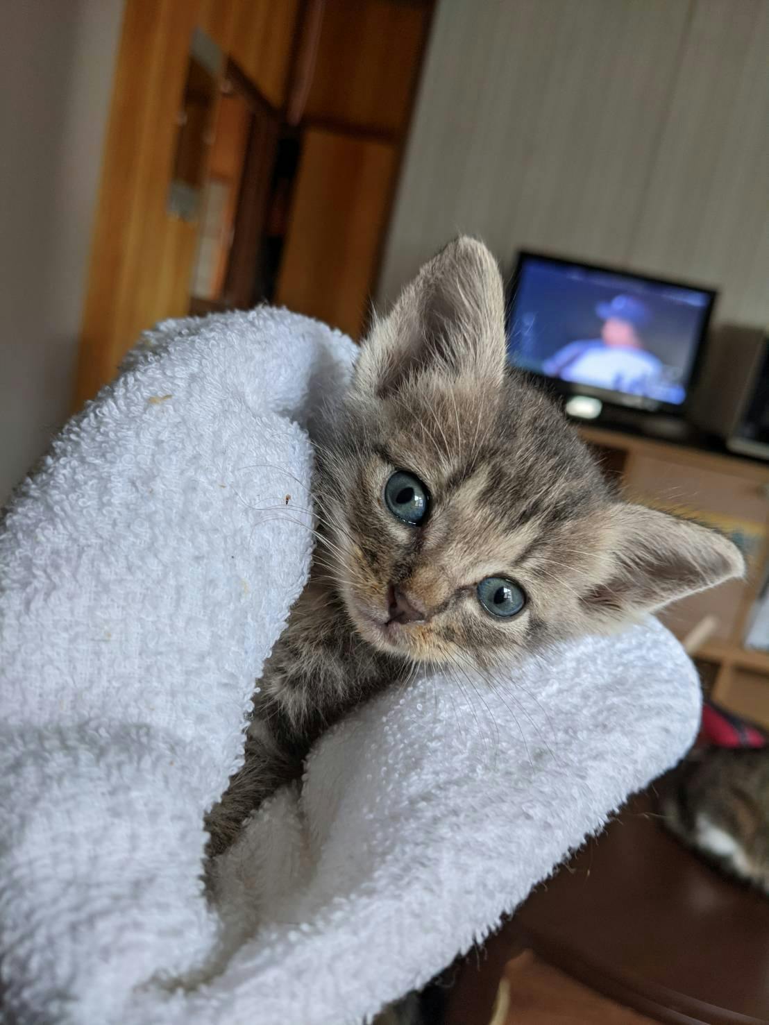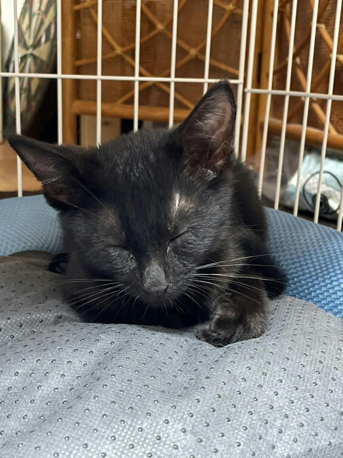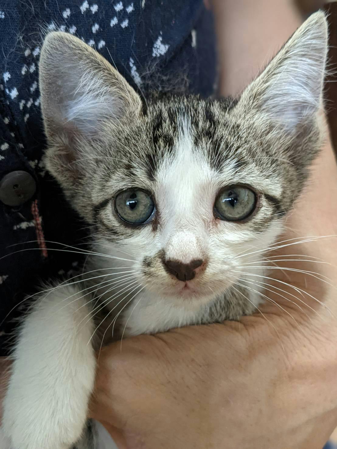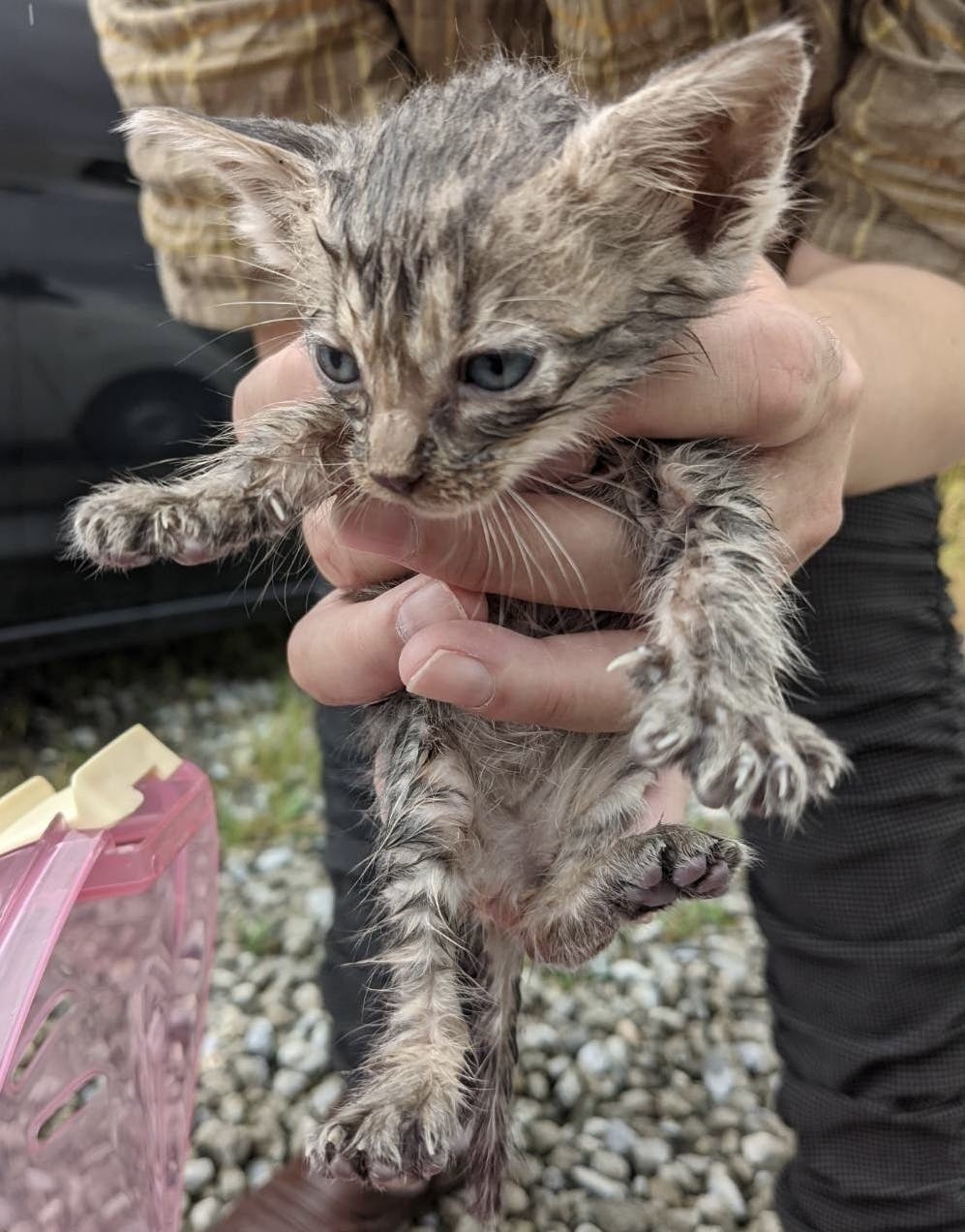 脚を引きずりながら、車通りのある所をよちよち歩いている子猫がいるから、保護して欲しいとの連絡があり、現地へ急行、車の下に入り込んだ子をなんとか保護しました。よく見ると右前脚がぷらんぷらんだったので、直ぐに病院へ、レントゲンを撮ったり、色々調べましたが、骨折も無く、生まれつきの神経障害だとゆう事と、栄養失調とゆう事でした。