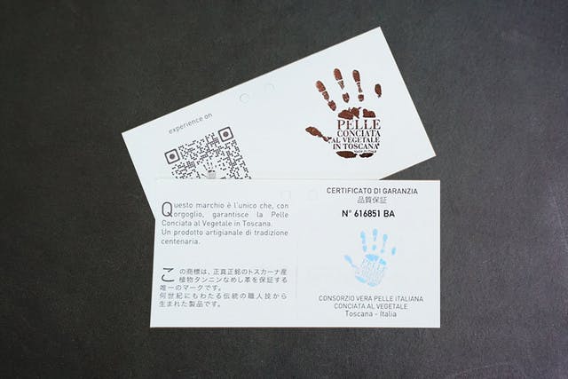 シリアルナンバー入りのイタリア植物タンニンなめし革協会発行のタグ付き