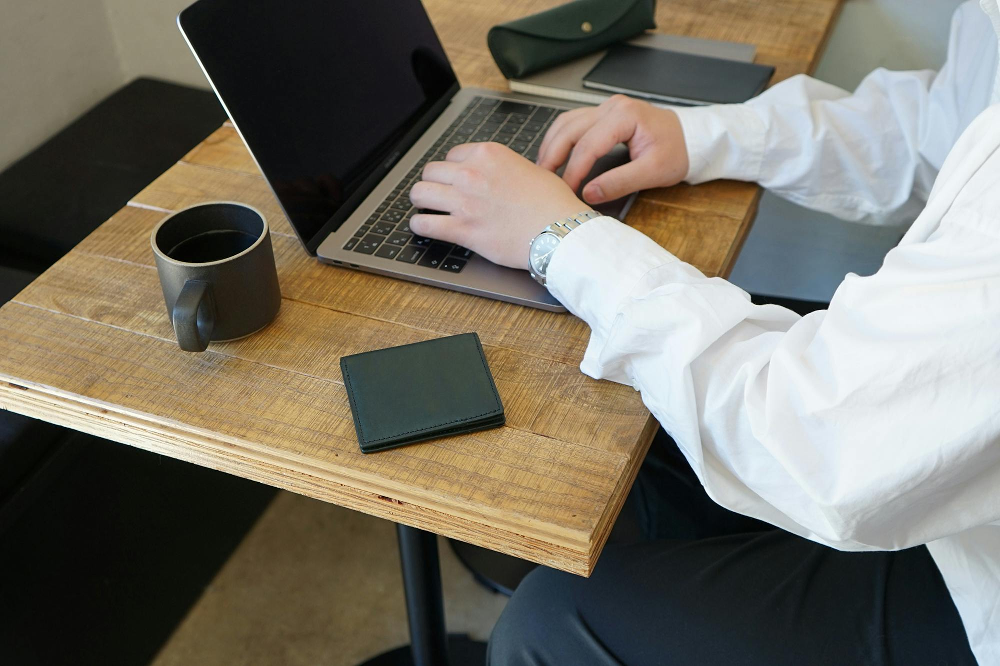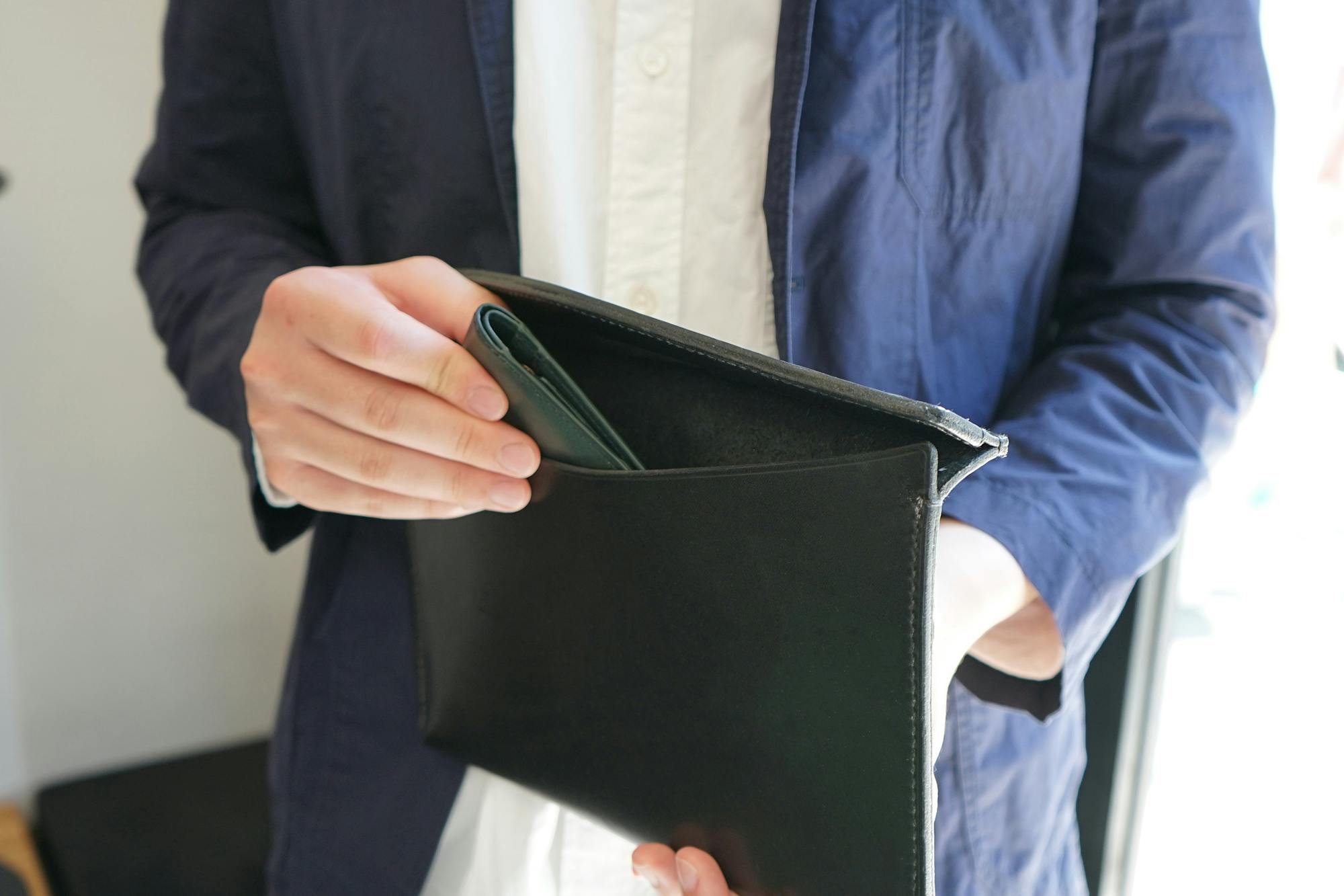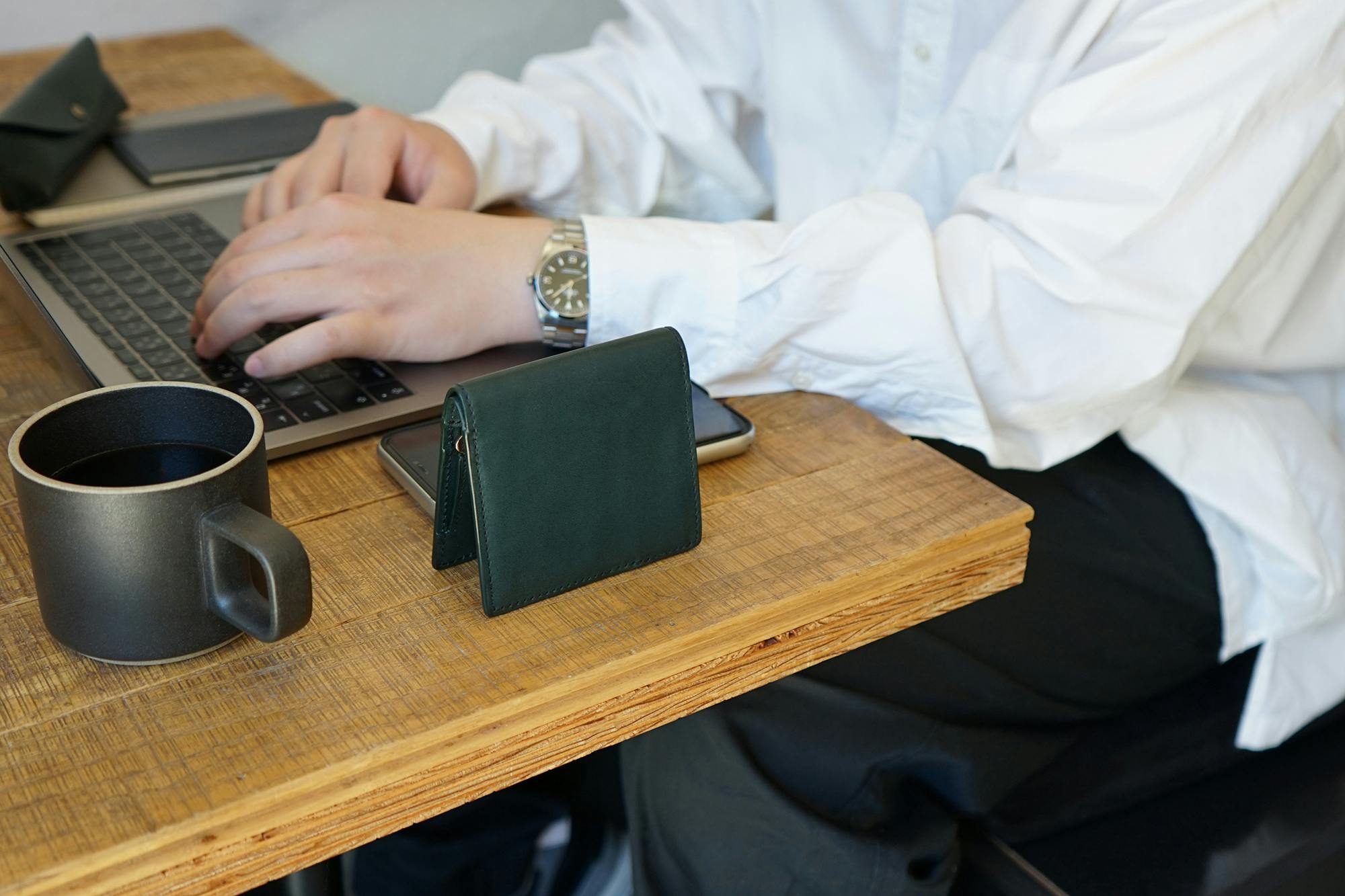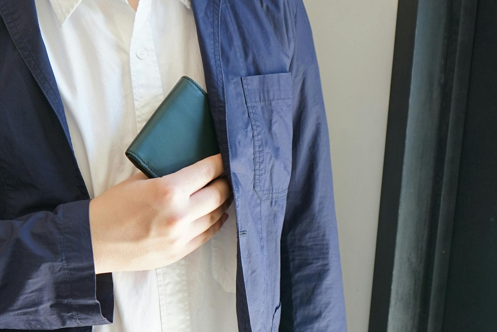 ジャケットの胸ポケットにもすっぽり収まるサイズ感で、薄マチなのでボッコリしません。