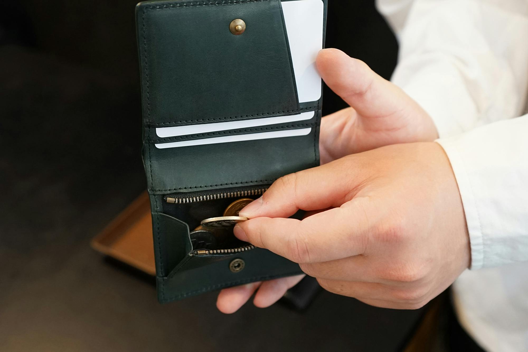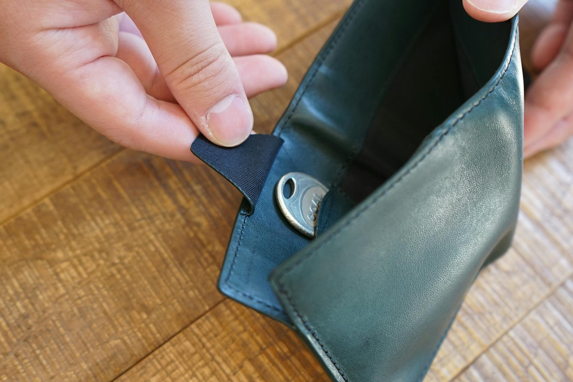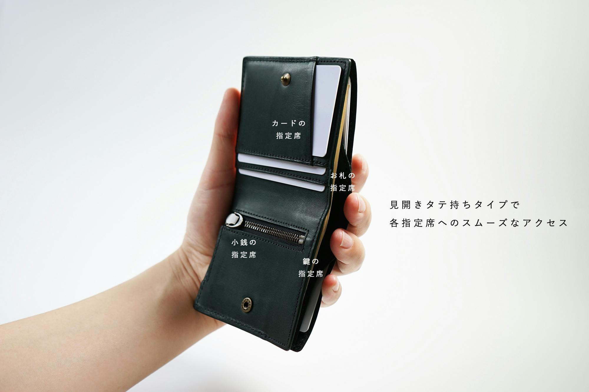 今、薄い財布が多く出ていますが、コインスペースとカードスペースをずらして薄くしています。そうすると、タテに長くなり、握ることはできません。さらに小銭入れはとても小さく、急いでいたり意識していないと、こぼれてしまいます。一番大切なお支払い時にいかにクイックでスマートかを大切に考えています。