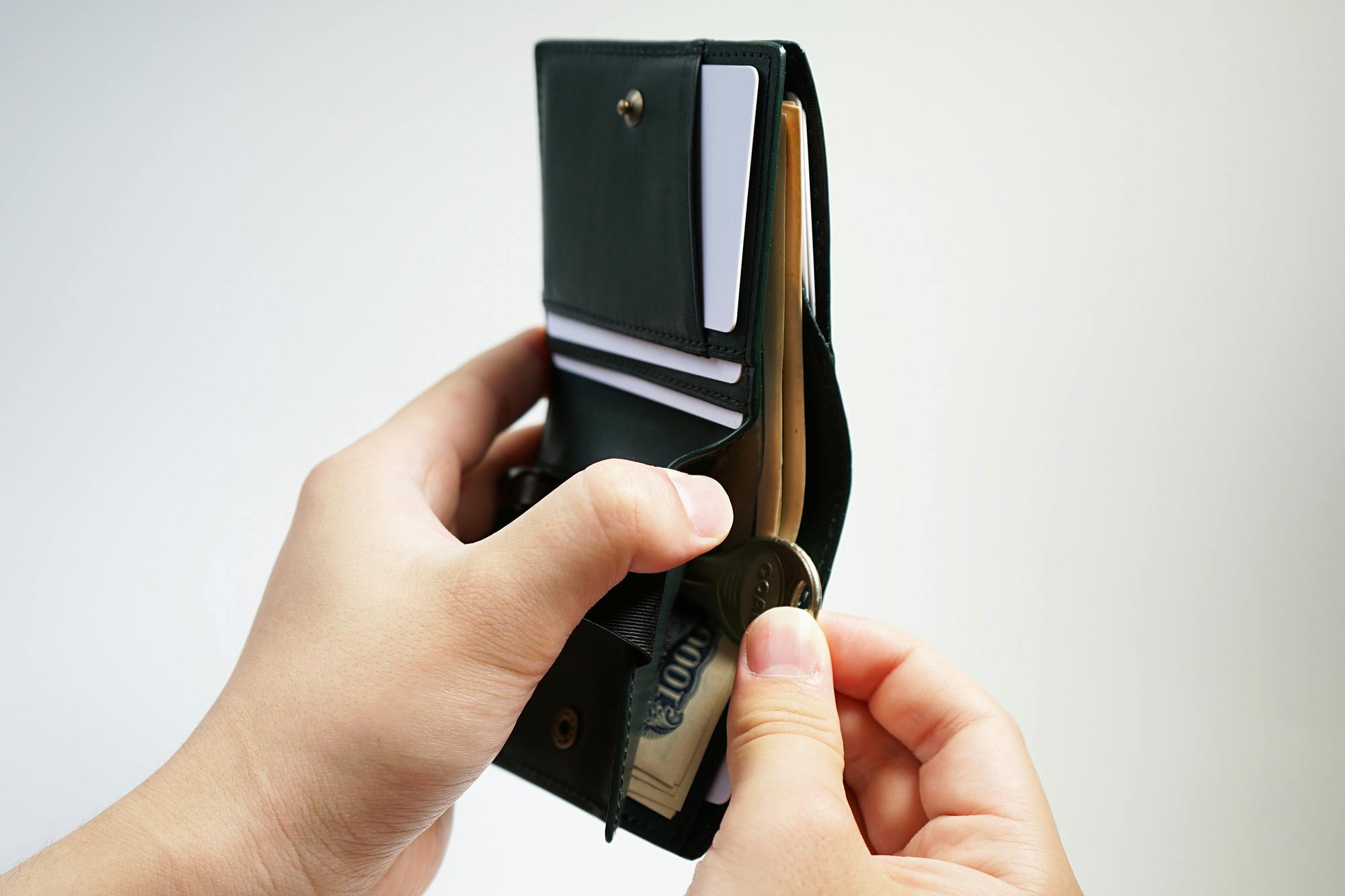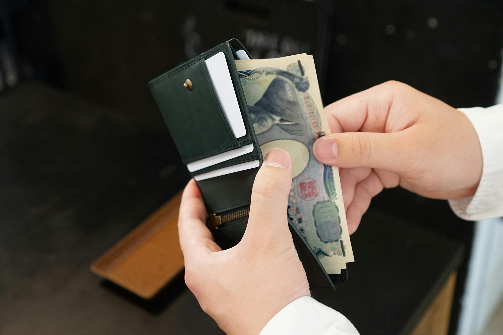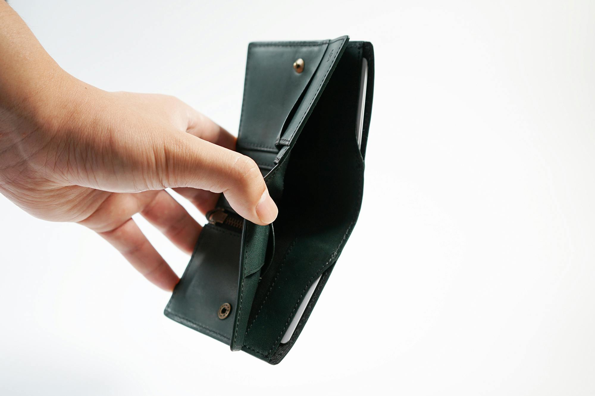 今、薄い財布が多く出ていますが、コインスペースとカードスペースをずらして薄くしています。そうすると、タテに長くなり、握ることはできません。さらに小銭入れはとても小さく、急いでいたり意識していないと、こぼれてしまいます。一番大切なお支払い時にいかにクイックでスマートかを大切に考えています。