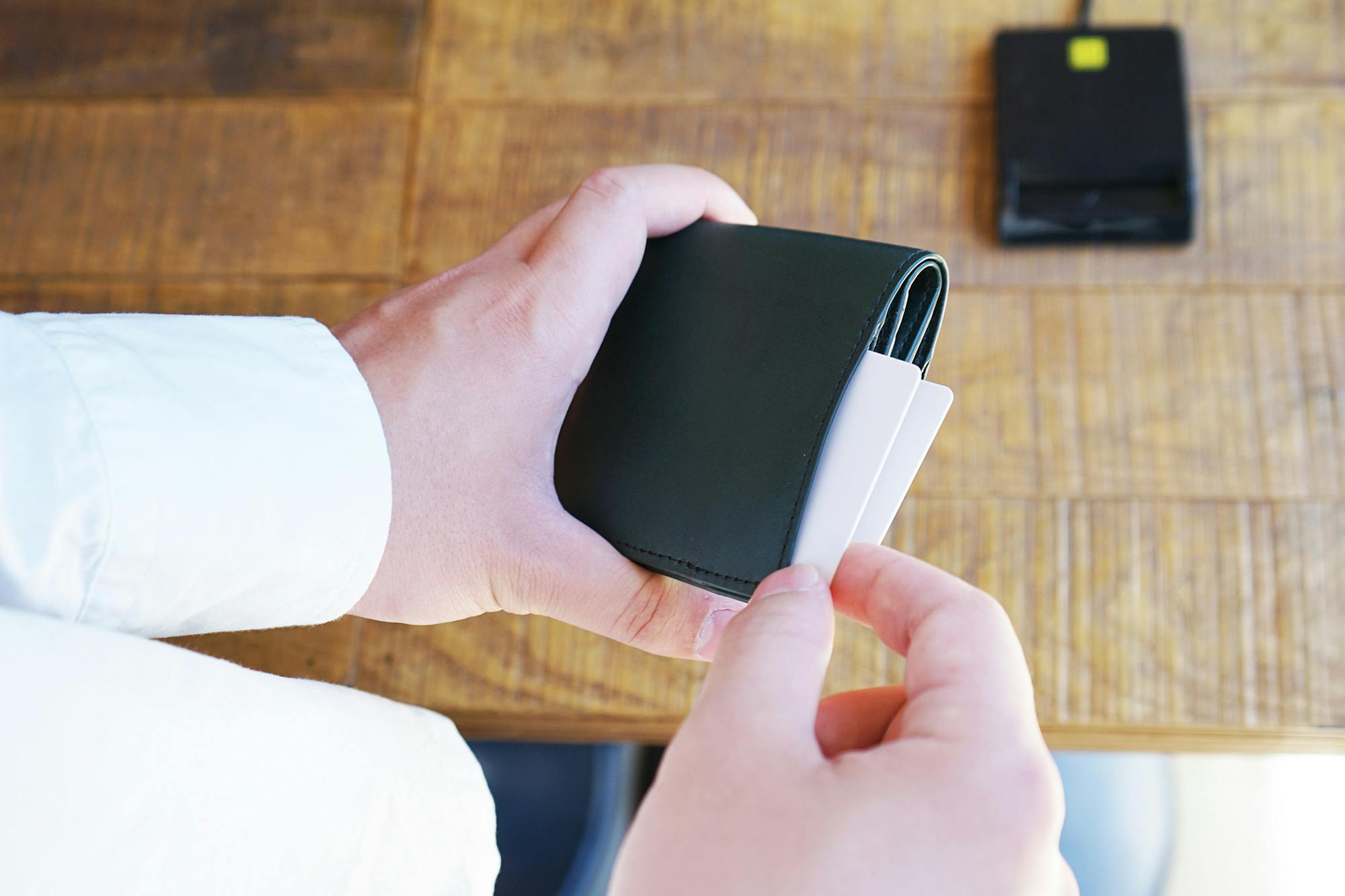 財布を開くことなく瞬時にカードをスライドして取り出して、差し込みタイプのカードリーダーに、瞬時に対応することが可能です。