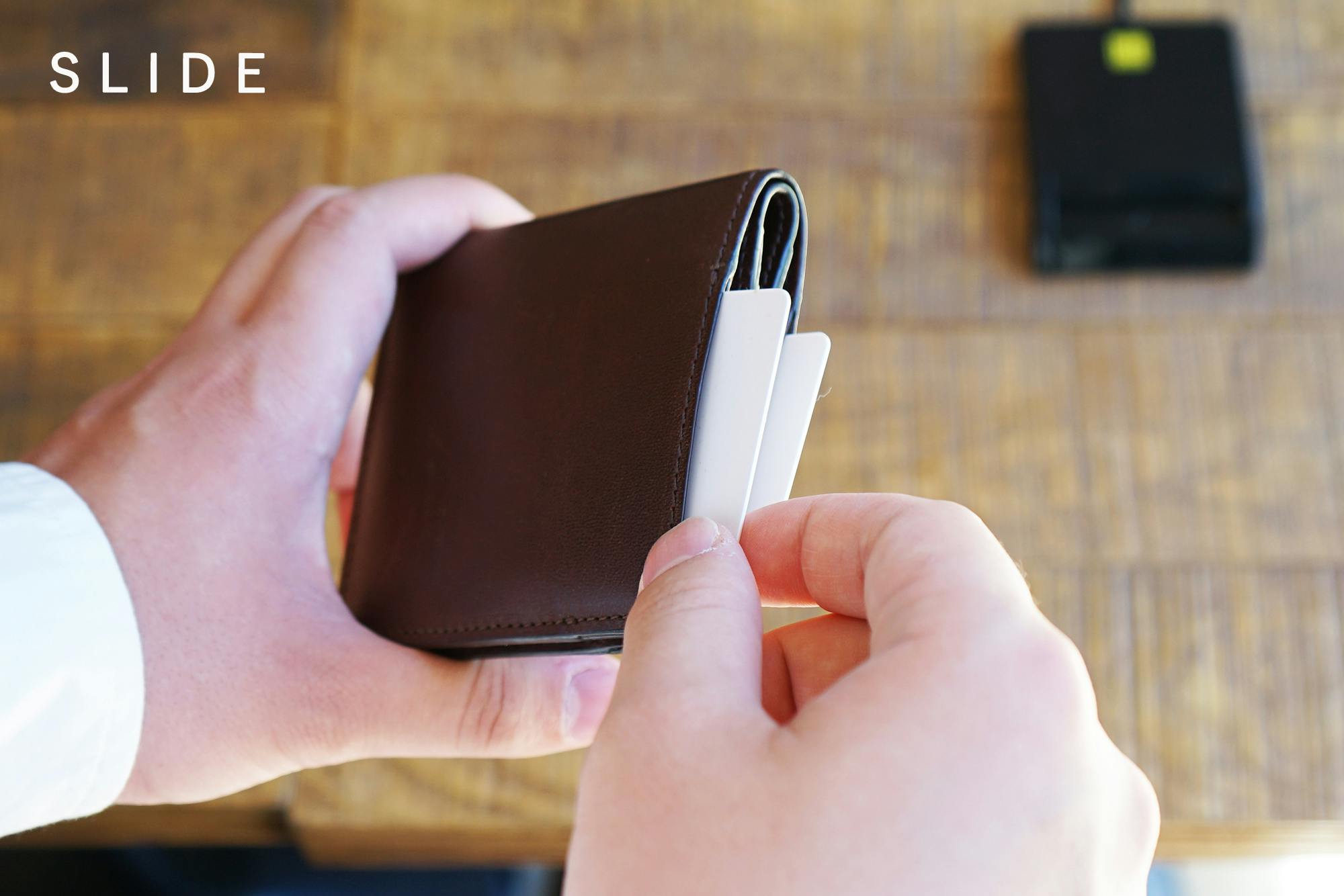財布を開くことなく瞬時にカードをスライドして取り出せます。