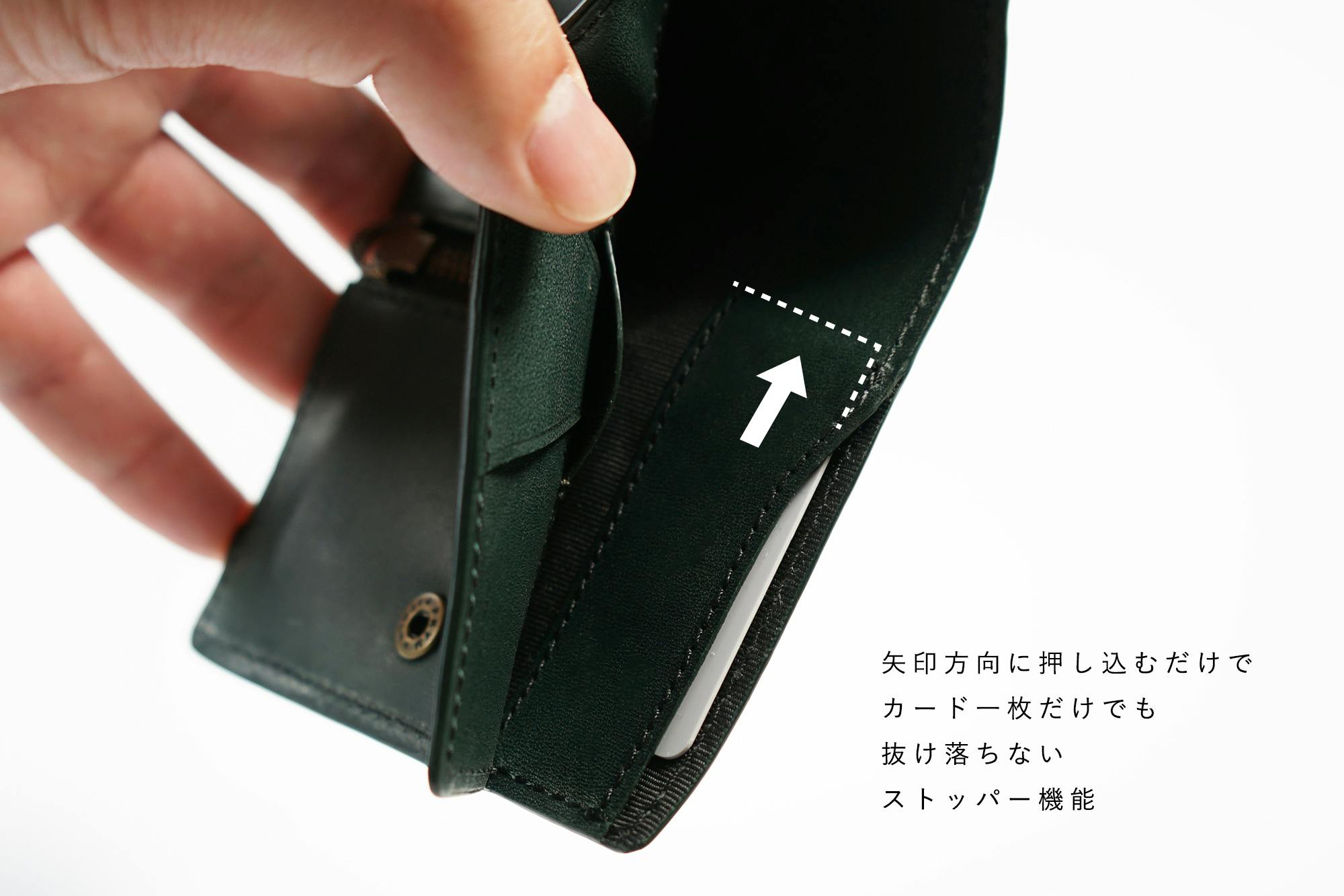 矢印方向に押し込むだけで、カード一枚だけでも抜け落ちないストッパー機能付。