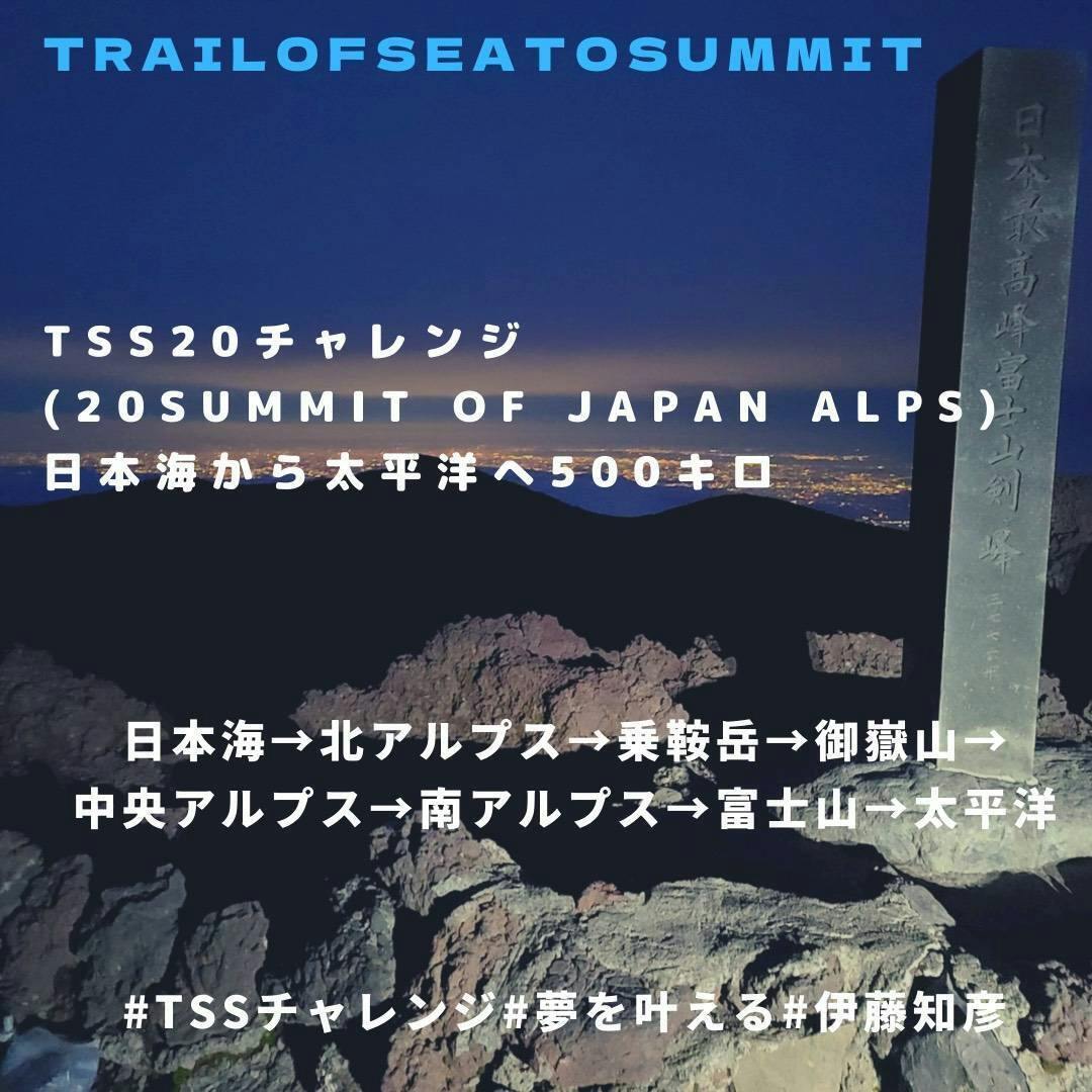 9月8日~19日に日本海から太平洋へ500km(累積標高36000M)のトレイルを、百名山20座を登頂しながら走破する「TSS20チャレンジ」(20summit of japan alps) に挑戦します。