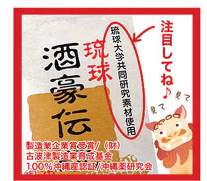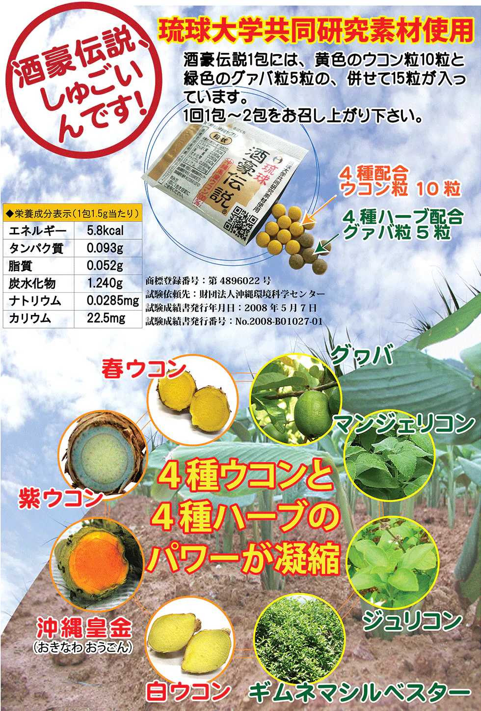 酒豪伝説のパッケージには「琉球大学共同研究素材使用」の文言も印刷されています。これは、酒豪伝説の元になった「融合ウコン」と「甘宝伝説」という2つのサプリメントが、平成6~8年の3年間にそれぞれ共同研究をしたことに由来しています。