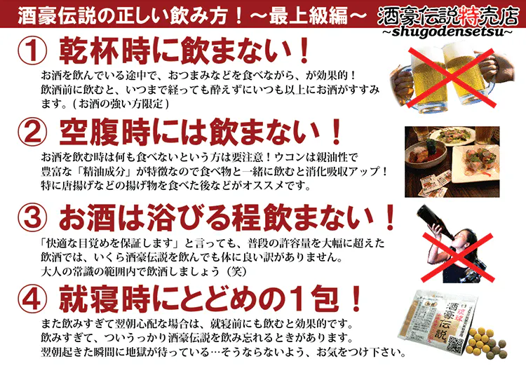 また商品に同封で「酒豪伝説の正しい飲み方!~最上級編~」も付いてきます。サプリメント自体は「食品」ですので、お酒と飲まれても、いつ、どんな呑み方をされても結構なのですが、【最も二日酔いを防げる】飲み方は、商品の特性と同様に知っていた方がお得です。